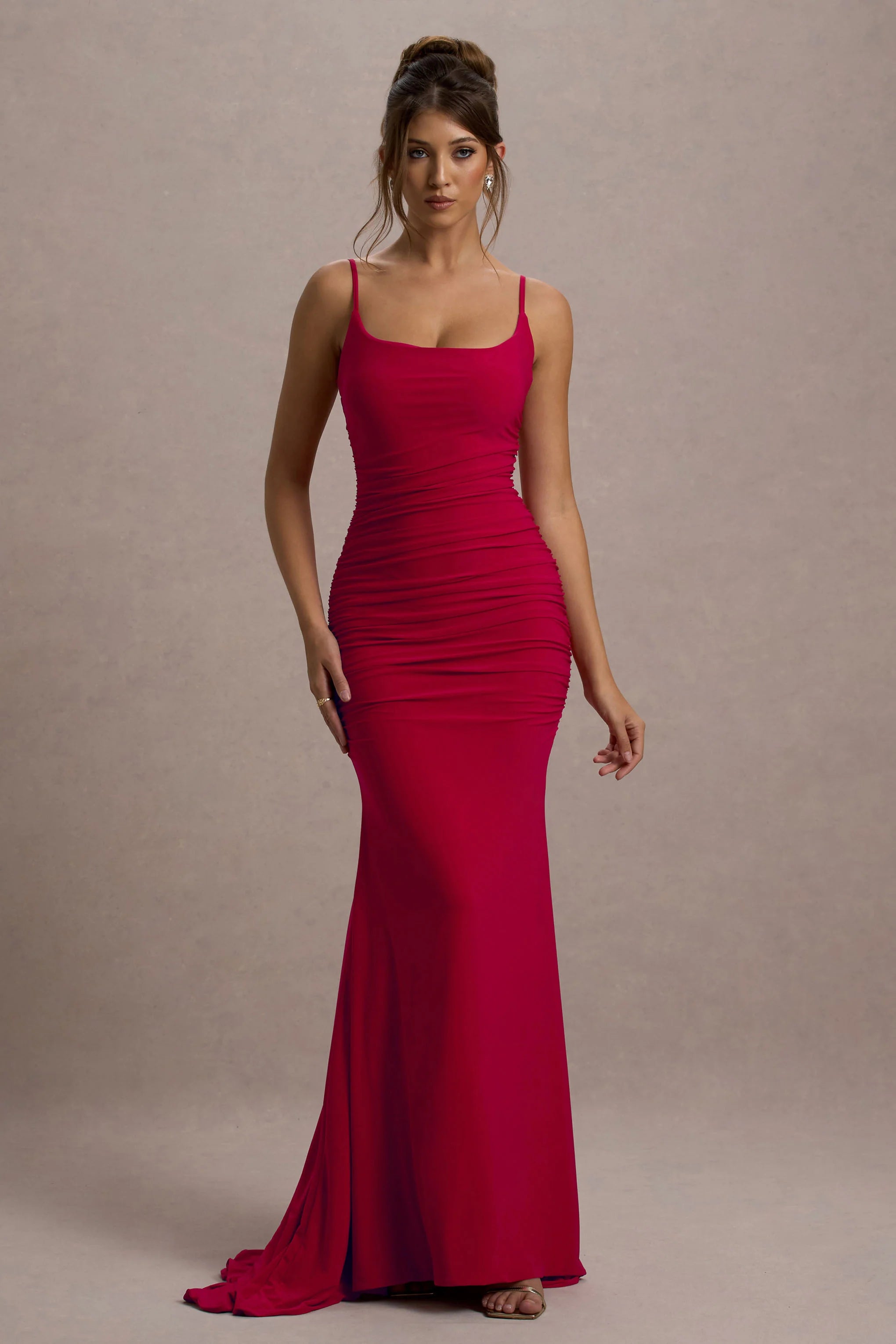 Who says the bride can solely bring the drama? Our latest maxi dress known as Adele is crafted from premium ruched jersey in a scarlet red hue. A plunging back is supported from delicate straps which can be adjusted for the perfect fit whilst a fishtail skirt showcases a godet train from behind.