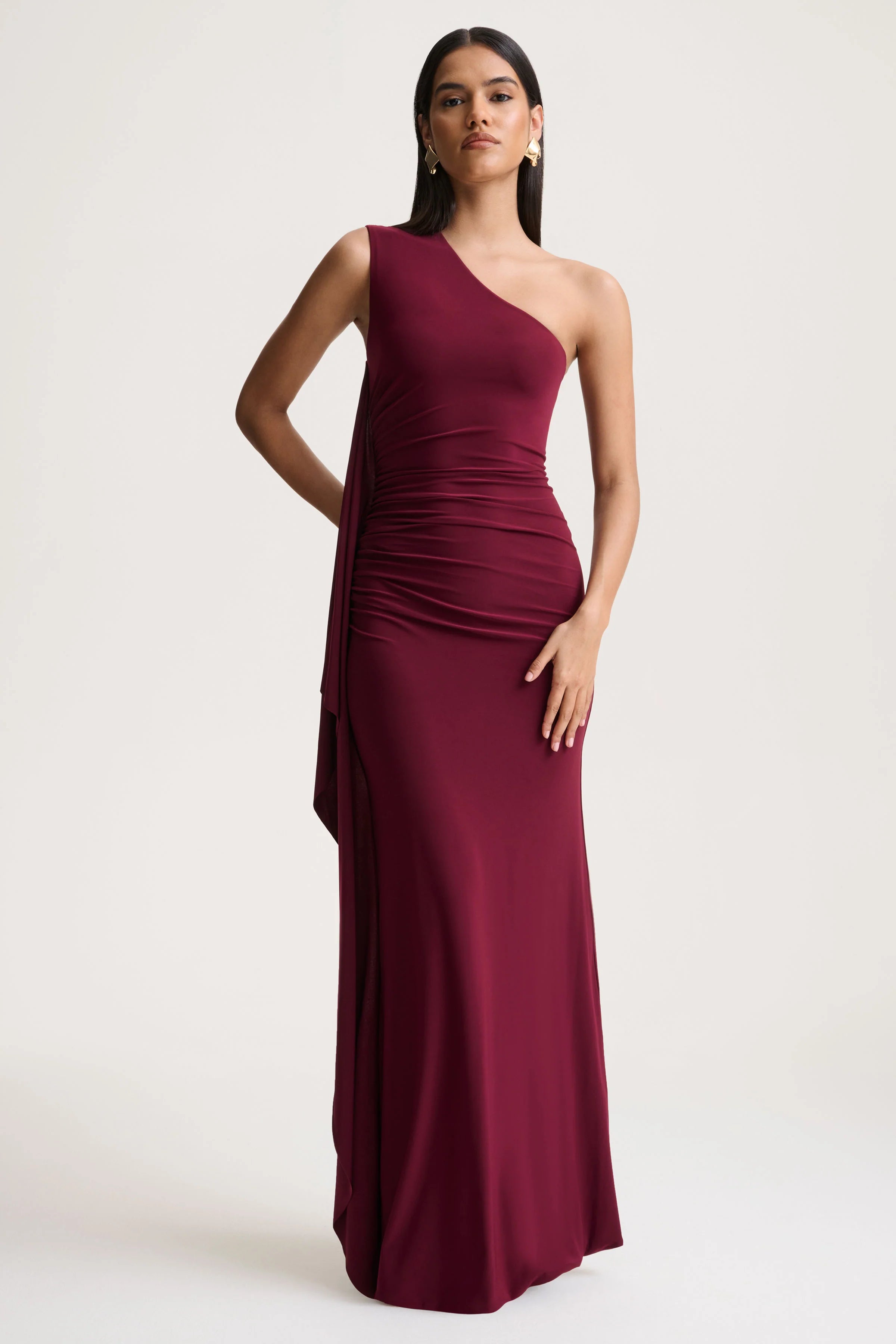 Defined by graceful lines and bold elegance, Adelina is a stunning option for your most special occasions. Crafted from premium jersey in a burgundy hue, this one-shoulder maxi dress exudes modern sophistication. The asymmetric neckline highlights the collarbone, while the expertly draped silhouette cascades beautifully to create effortless movement. Adelina is perfect for a look that radiates contemporary charm.
