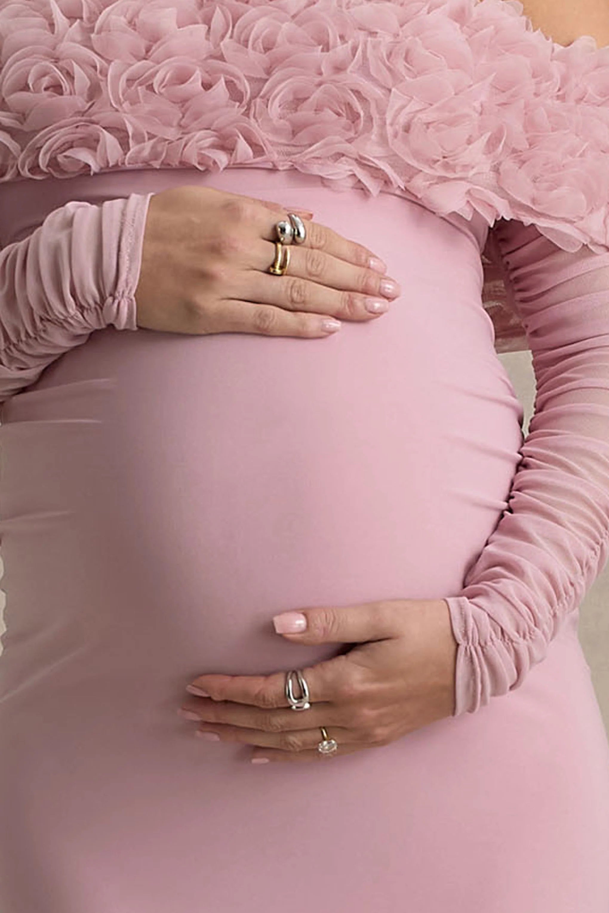 Adita is the perfect blend of elegance and comfort for your next special occasion. Crafted from our premium blush pink jersey and mesh, this bardot maternity midi dress features delicate floral details that add a romantic touch. The off-shoulder neckline beautifully frames your collarbone, while the soft, stretchy fabric is designed to comfortably flatter your growing bump. With its feminine silhouette and intricate detailing, Adita ensures you’ll feel both radiant and relaxed.