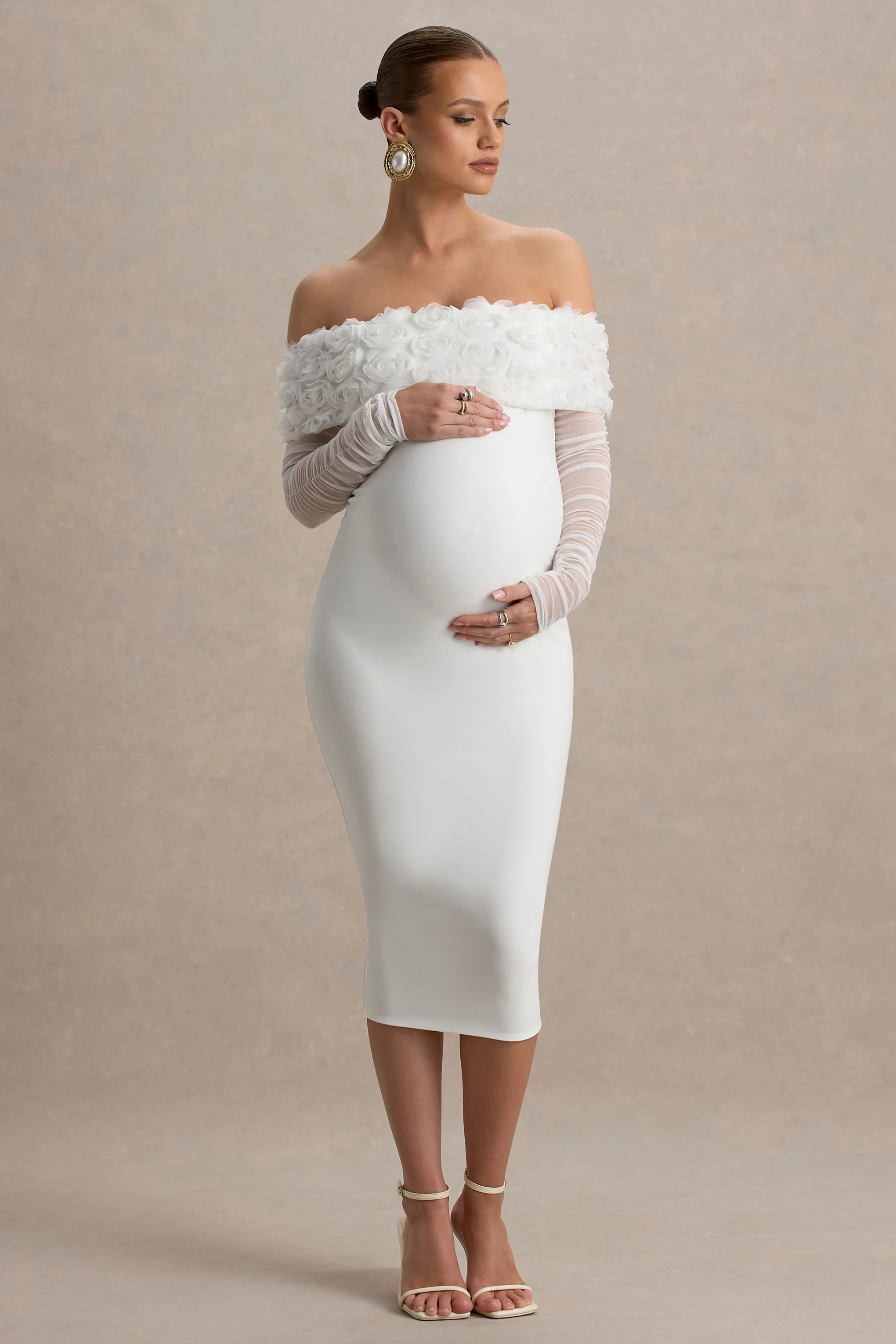Adita is the perfect blend of elegance and comfort for your next special occasion. Crafted from our premium white jersey and mesh, this bardot maternity midi dress features delicate floral details that add a romantic touch. The off-shoulder neckline beautifully frames your collarbone, while the soft, stretchy fabric is designed to comfortably flatter your growing bump. With its feminine silhouette and intricate detailing, Adita ensures you’ll feel both radiant and relaxed.