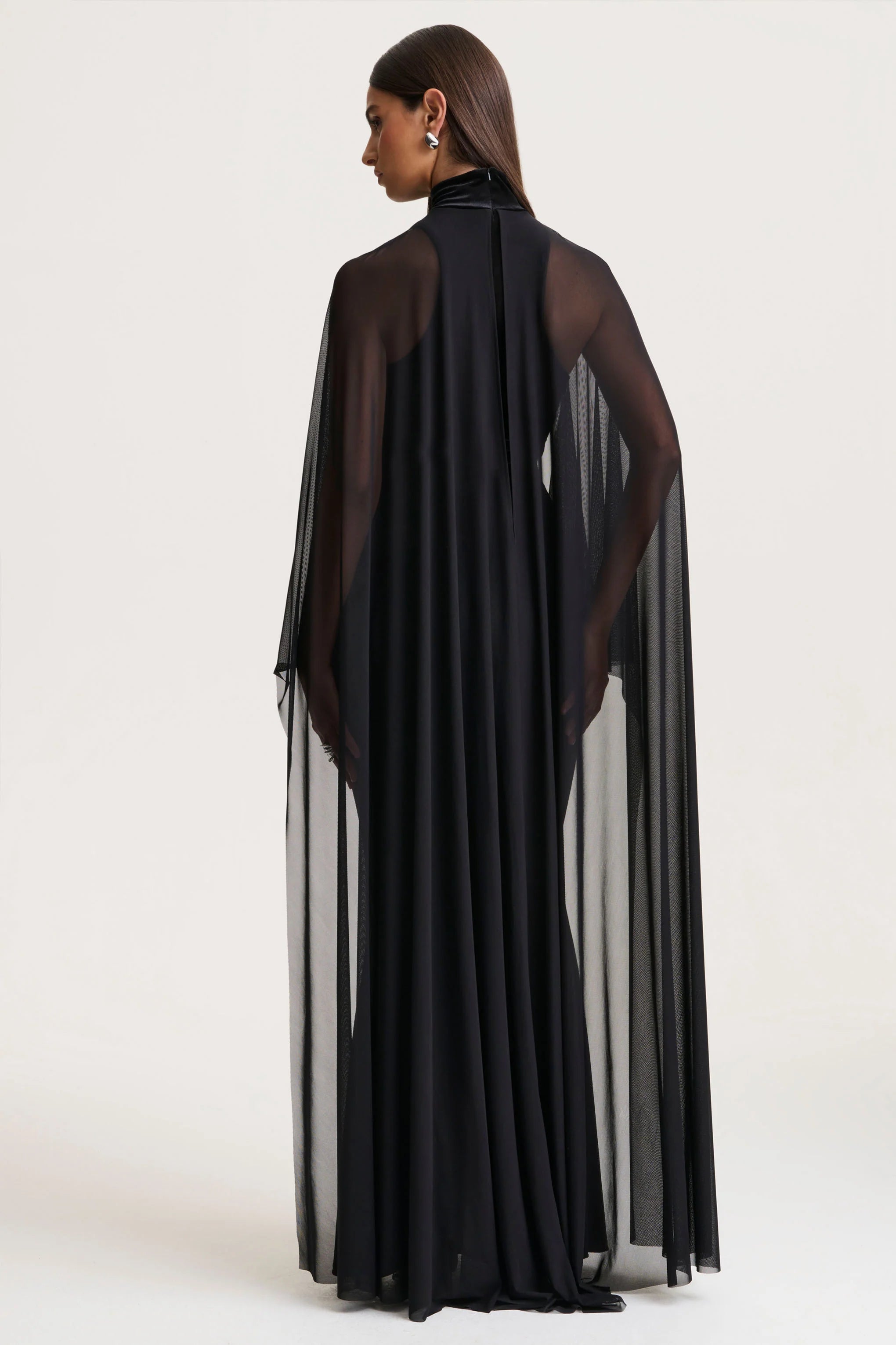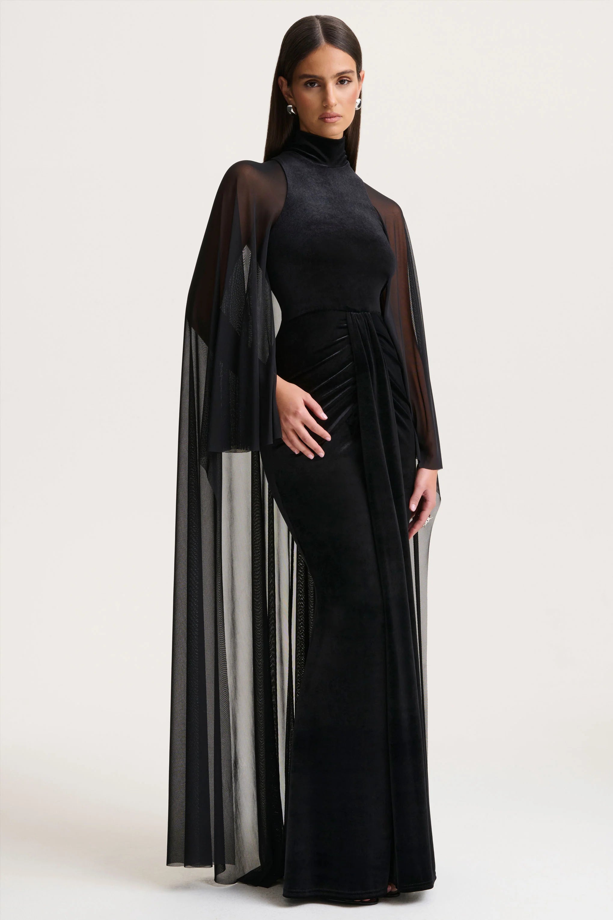 Adoring captures timeless elegance with a touch of dramatic charm. Crafted from our premium velvet in a deep black hue, this maxi-length design drapes beautifully over the silhouette. The high neckline frames the look with refined sophistication, while the cape detail adds movement and a statement finish. Soft gathered detailing enhances every curve, making Adoring a perfect choice for evenings that call for grace, confidence, and classic glamour.