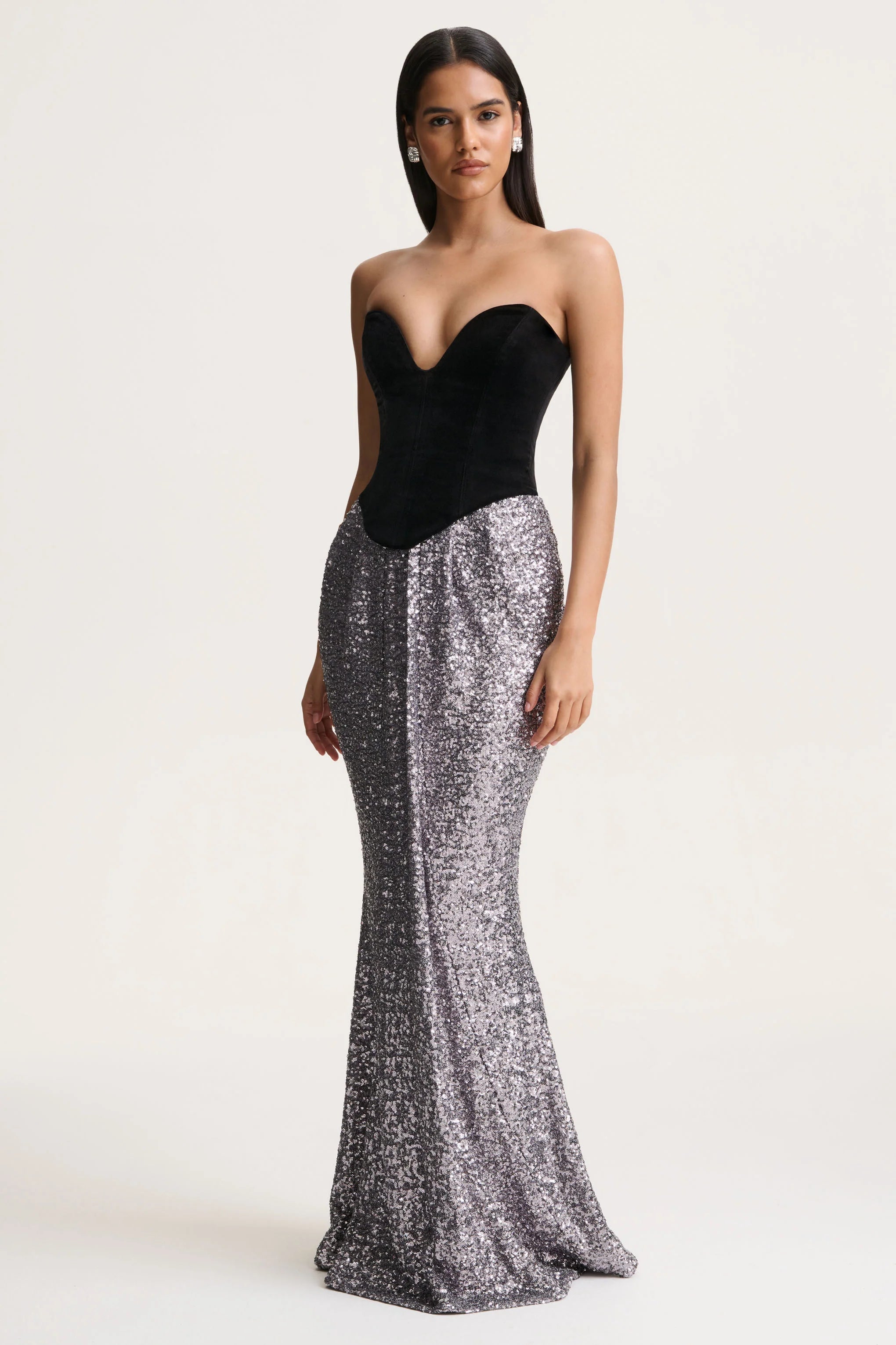 Strike the perfect balance of drama and elegance with Aeris. Featuring a sculpted corset bodice in a rich black velvet, this maxi design is finished with a dazzling silver sequin skirt for a show-stopping contrast. The plunge neckline and adjustable cami straps add a sultry touch, while the floor sweeping silhouette ensures an unforgettable entrance. Aeris is made for evenings where glamour takes centre stage.