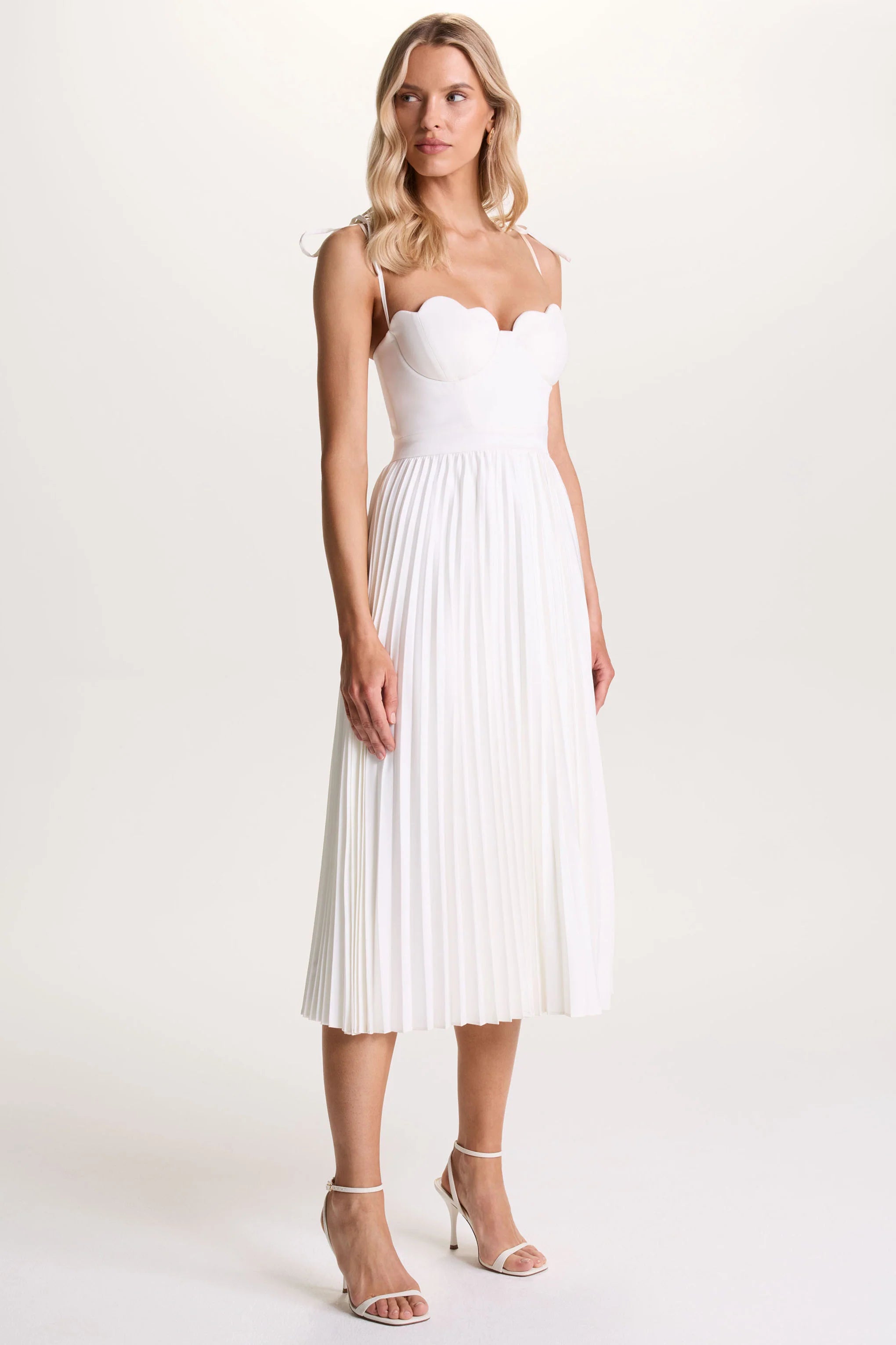Look effortlessly chic this season in our Agua midi. Cut in a classic cream shade of our premium stretch satin, this timeless dress exudes elegance. Featuring a feminine neckline that frames your decolletage and is elevated with scallop-edged cups, for a modern twist. The pleated skirt adds movement with every gesture, making Agua the perfect option for events that call for dancing. Style with gold accessories for a look that'll capture the room's attention.
