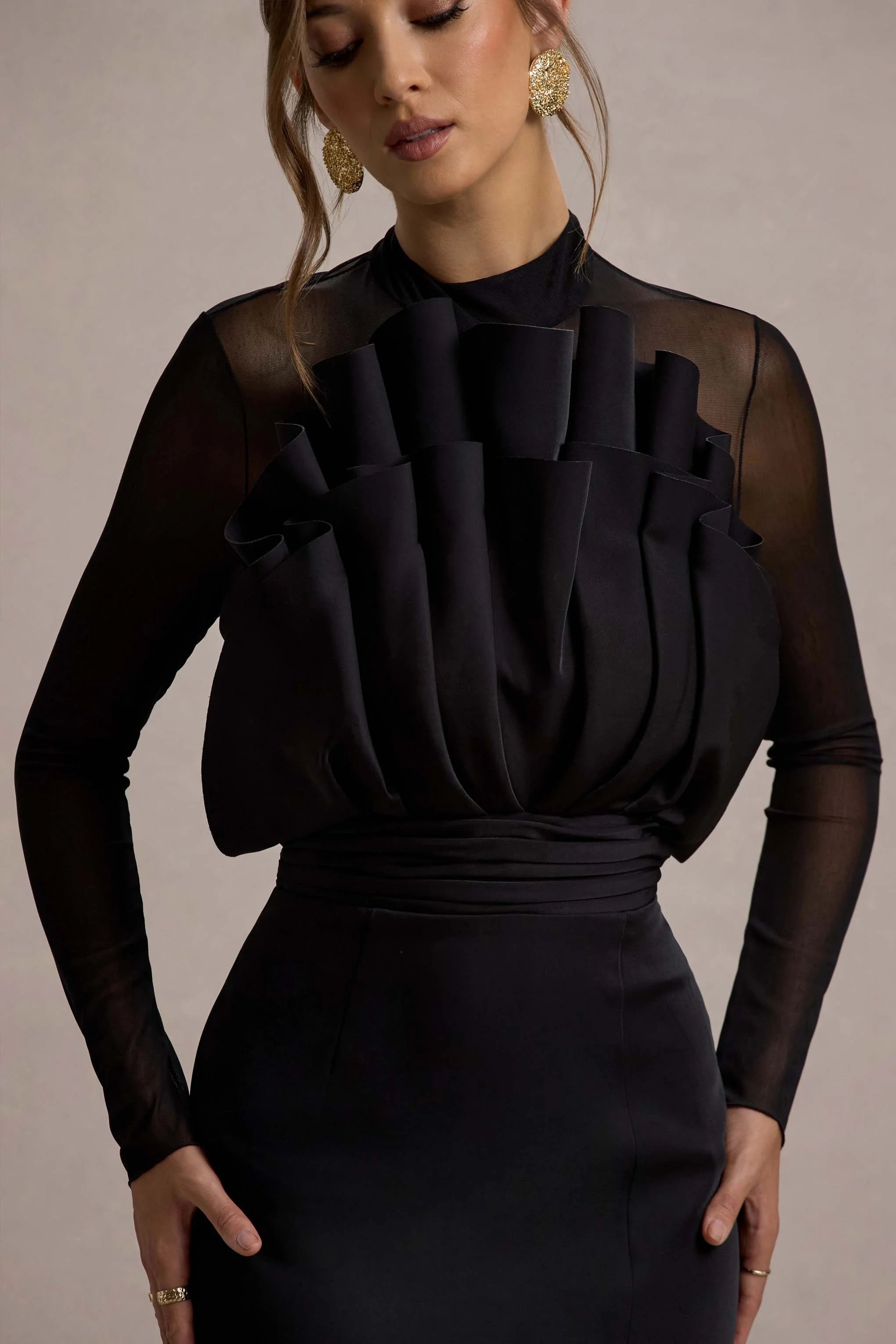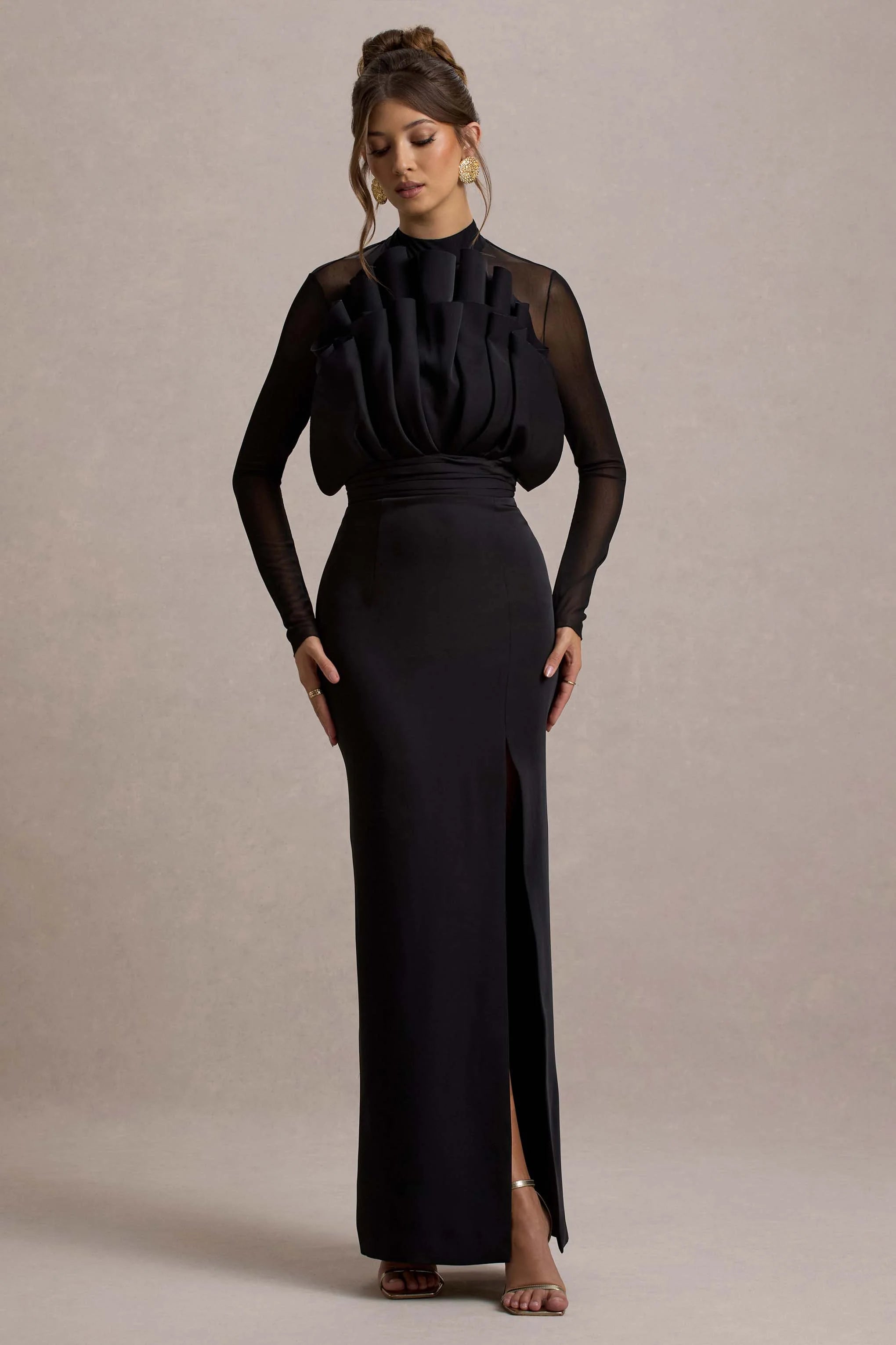 Dial up the drama this event season in Alder, our show-stopping maxi. Designed in a midnight black shade of premium crepe, this floor-sweeper boasts a high neckline, long sheer sleeves and ruffled neckline. Complete with a waist-cinching lace-up back and high-leg split, whats not to adore with Alder?