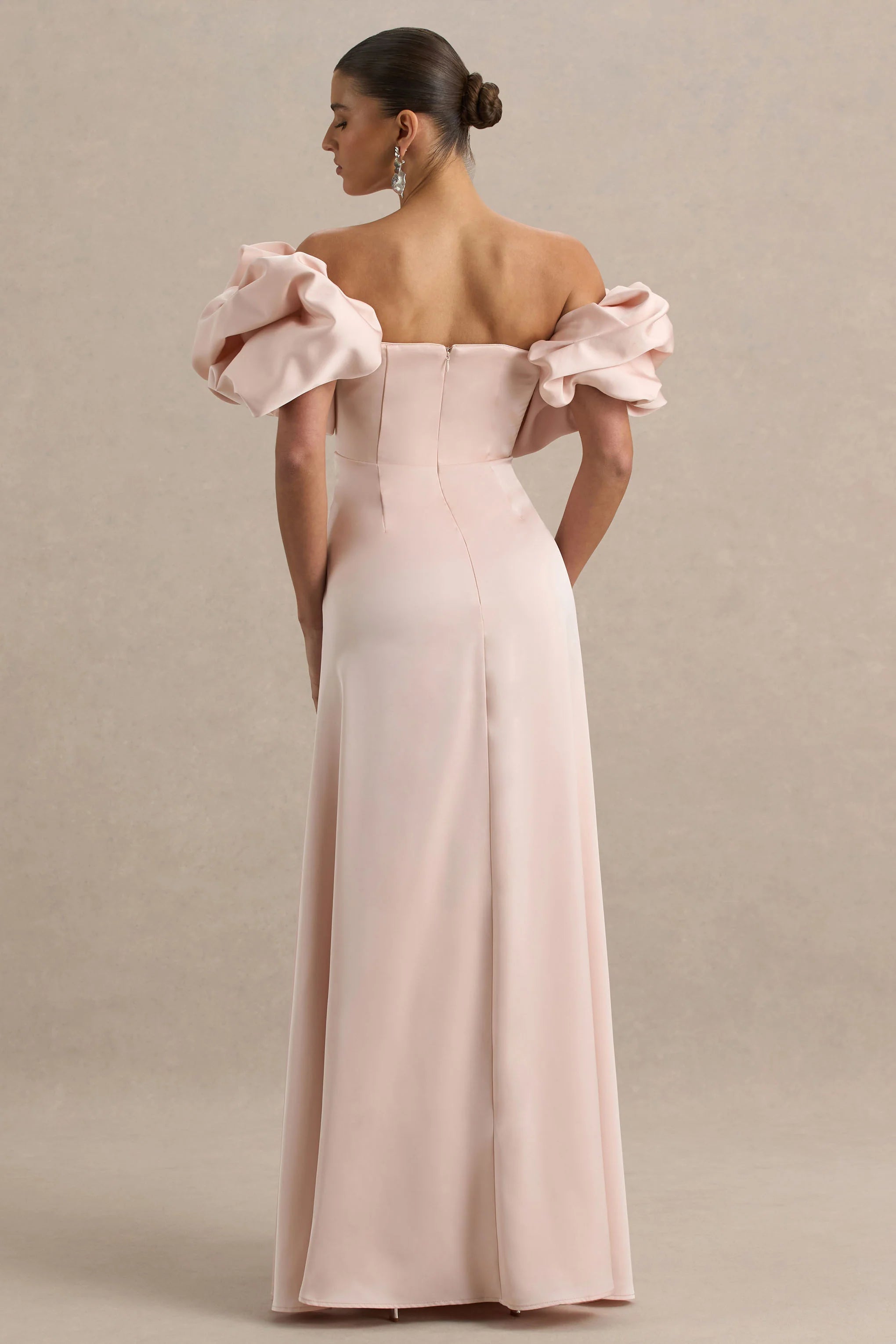 Exude romantic elegance in our latest gown, Allie. Cut in a soft pale pink shade of our premium stretch satin, this detailed maxi is one you won't be forgotten in. The ruffled bardot neckline, that seamlessly blends into statement puff sleeves, gives this piece a sultry edge that gracefully highlights your decolletage. In Allie you will make an entrance at any special occasion. Style this show-stopper with sparkling earrings and be ready to have all eyes on you.