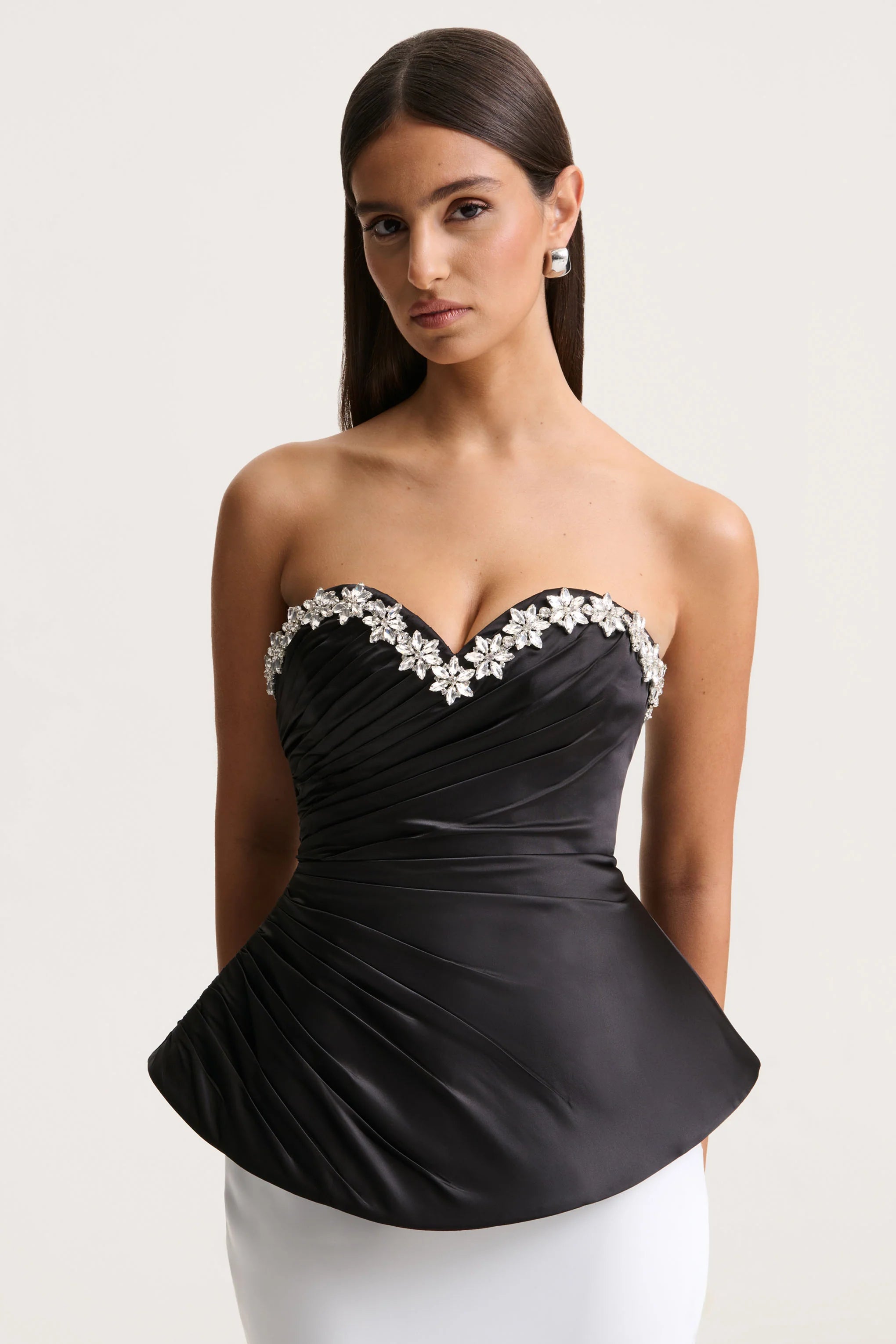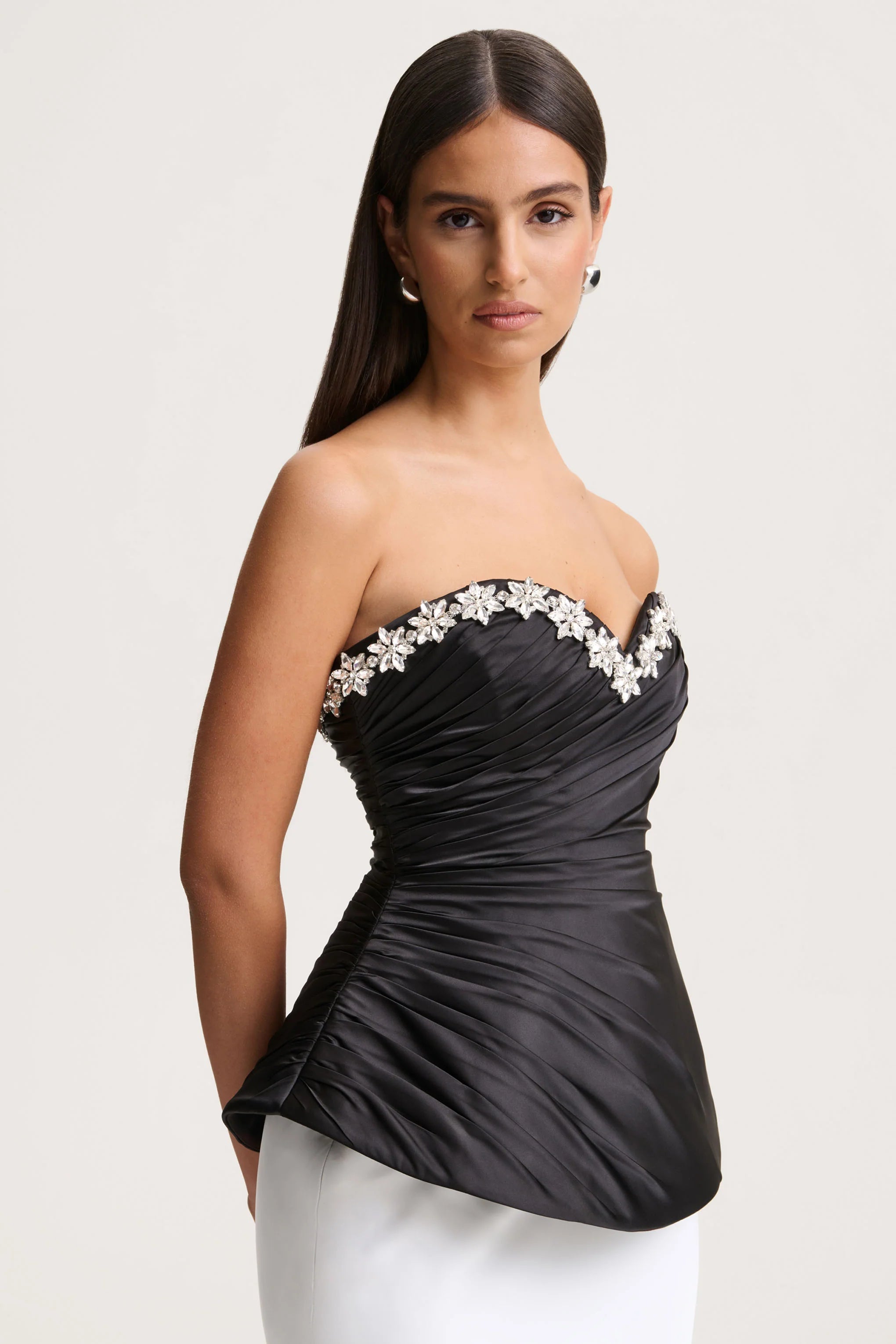 Say hello to Ambria, a true statement of sophistication and allure. Crafted from our premium black satin, this corset top cinches you in for a flawless fit. Featuring a hand-embellished sweetheart neckline that beautifully frames the décolletage. The gathered detailing enhances the silhouette, creating a sculpted, feminine shape that exudes confidence. Luxurious and elegant, Ambria is the perfect choice for evening occasions that call for timeless glamour.