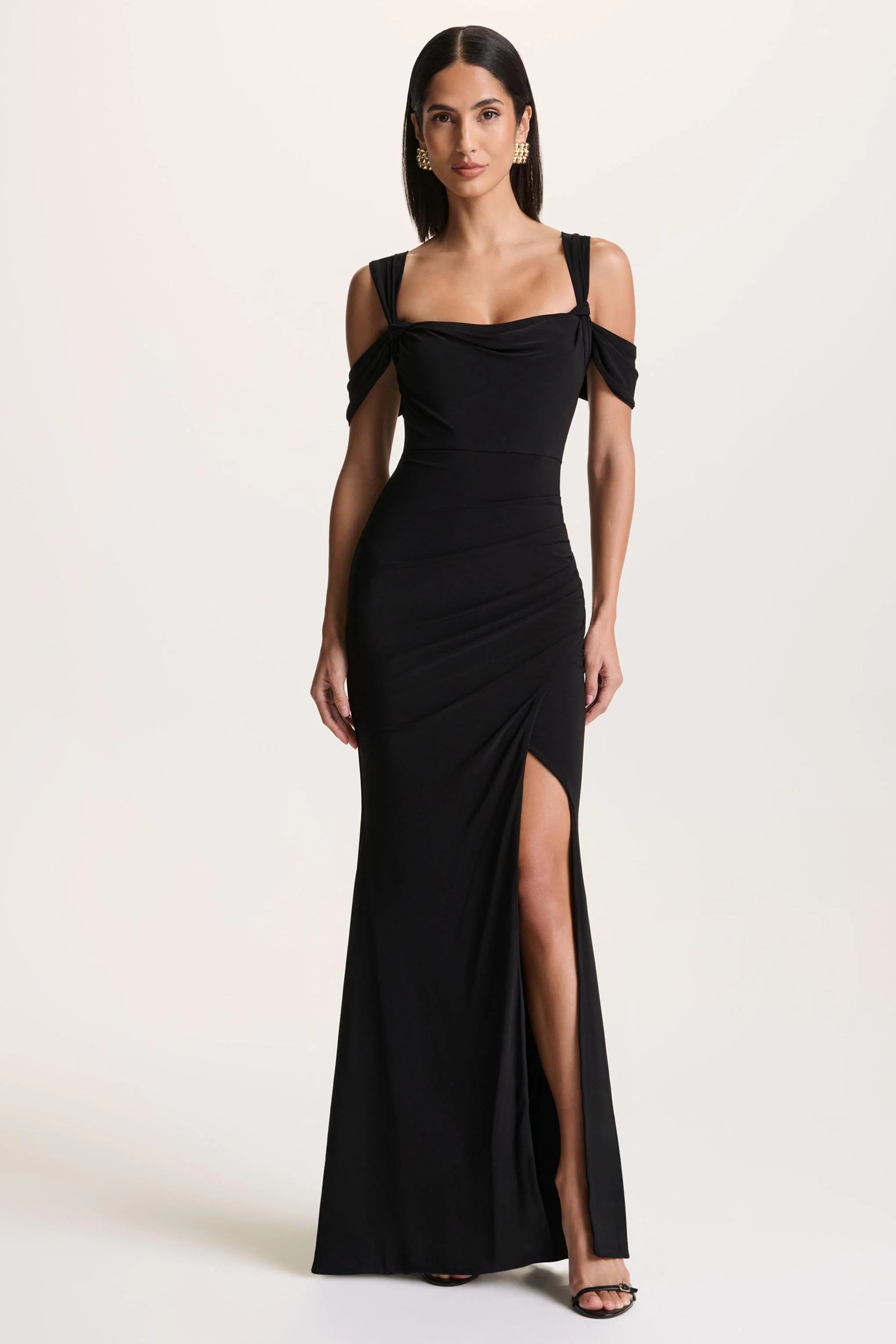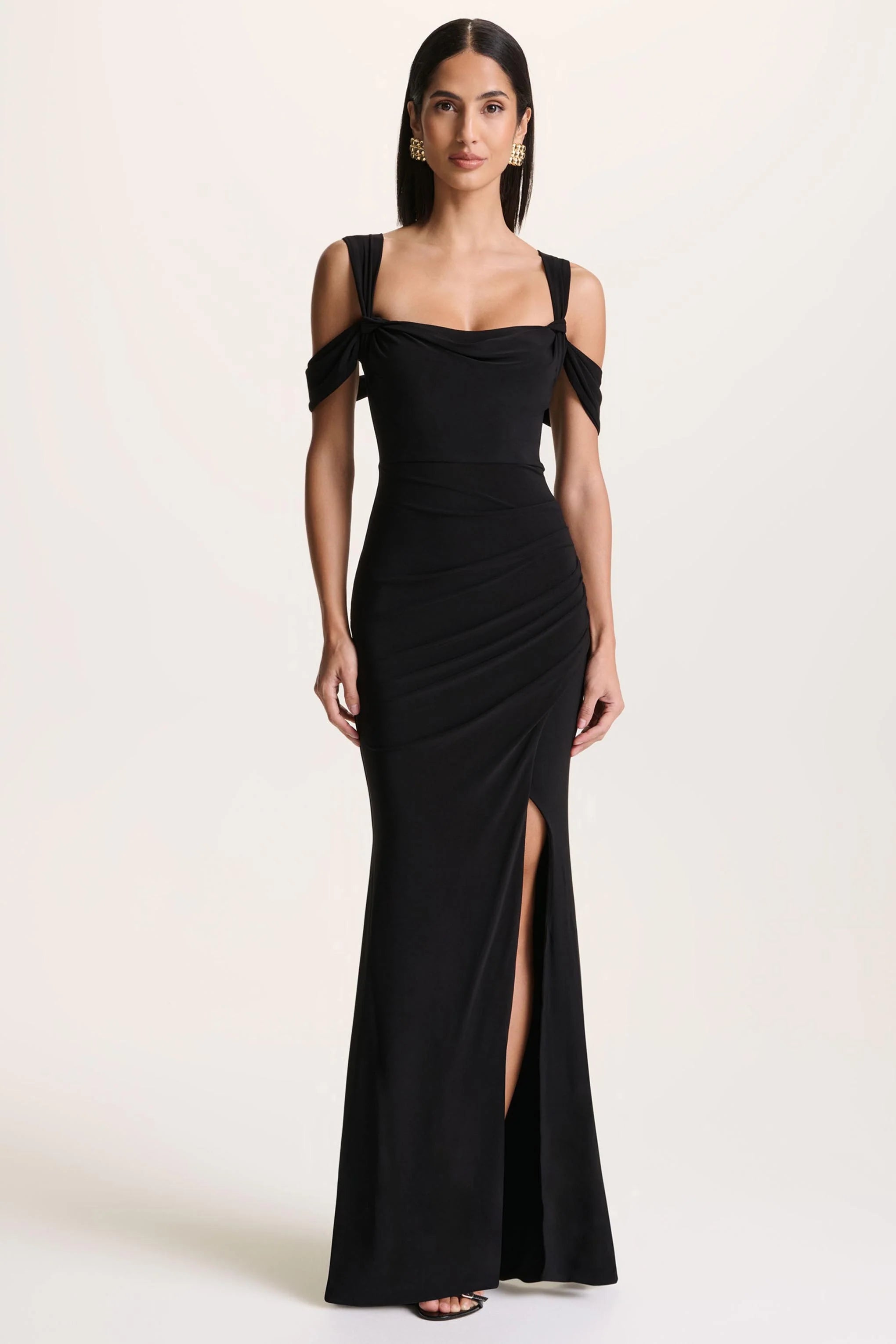 Revel in romance this event season in Amoura, our enchanting black maxi dress. Arriving in a form-flattering silhouette of our premium stretch jersey, this show-stopper boasts a square neckline, knotted straps and artful draped sleeves. Complete with a wrap skirt and high-leg split, Amoura is the perfect event piece.