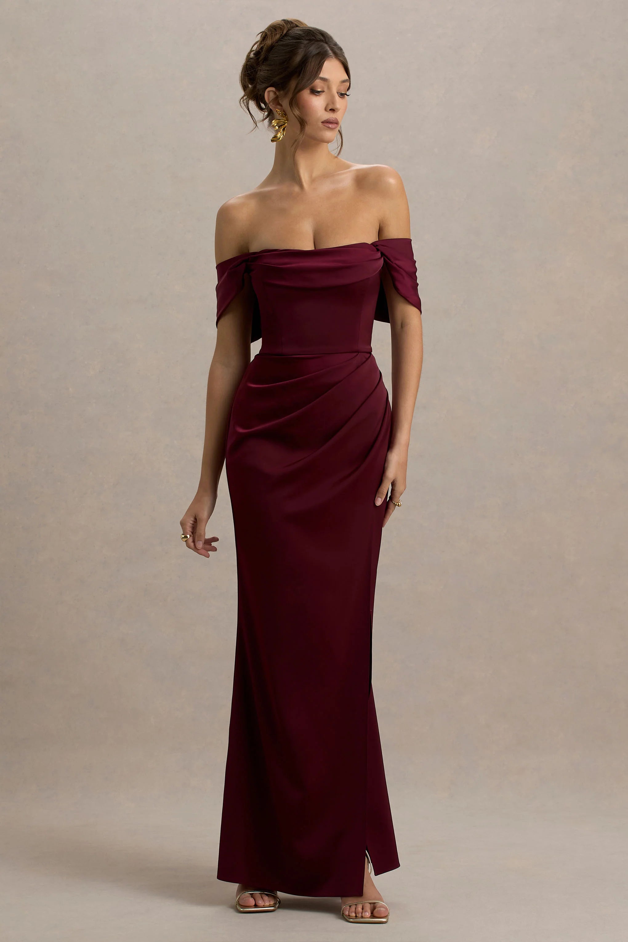 Make an entrance in Annie, a dress that exudes timeless elegance and sophistication. This show-stopping maxi is cut in a burgundy shade of our premium satin that allows this gown to drape beautifully over your curves. The bardot necklines highlights your decolletage, for a feminine finish, while the ruched detailing cinches your waist for a sculpted silhouette. No matter the occasion, in Annie all eyes will be on you. Pair with strappy heels and statement earrings for a look that is utterly breathtaking.