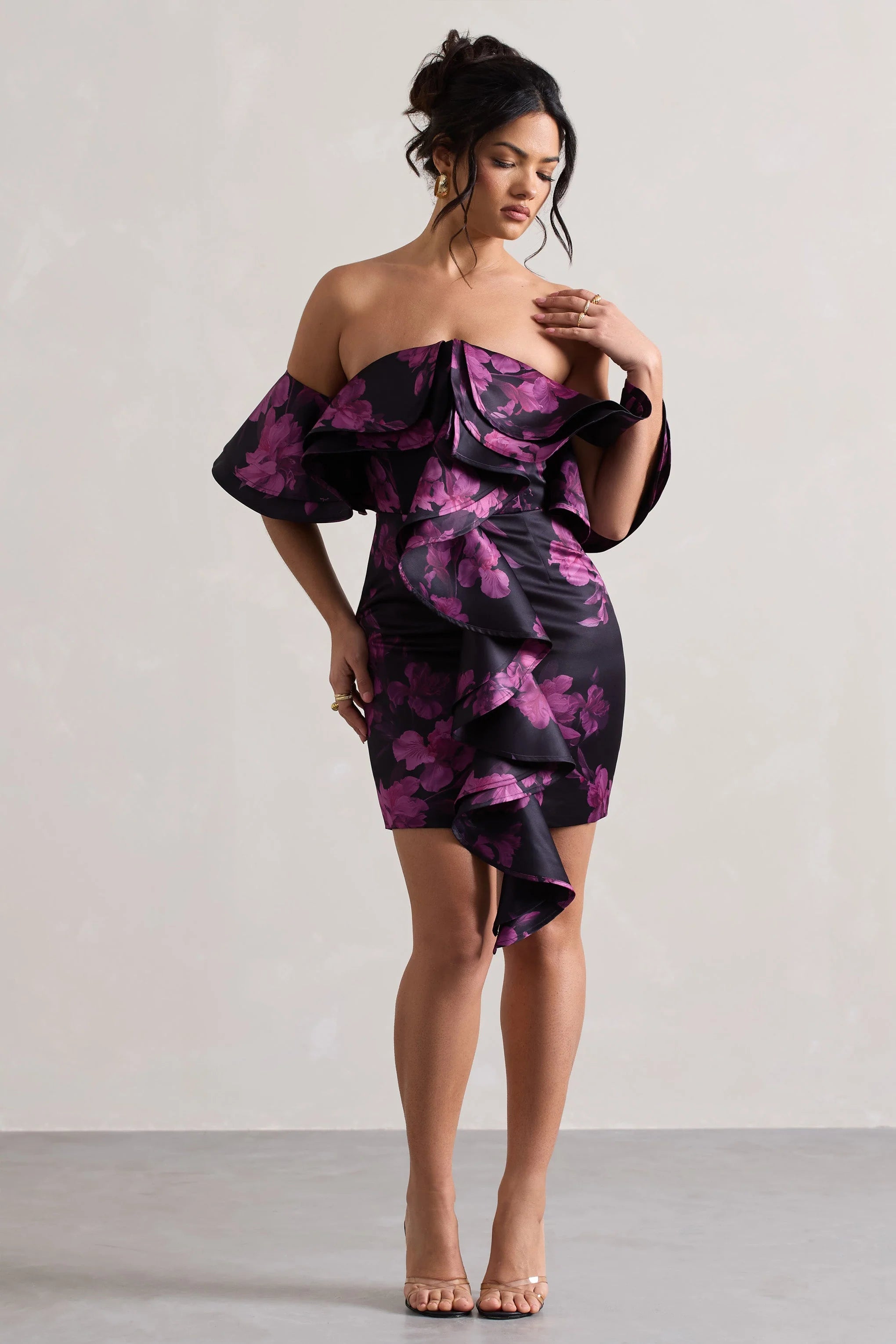 Defined by cascading ruffles, Aspen has everything you need to stand out from the crowd. Arriving in a black floral print of our premium heavy satin, this bardot mini dress is an enchanting option for any upcoming birthday soirée or cocktail party. Give Aspen's neckline the attention it deserves by styling it with a sleek bun at your next event.