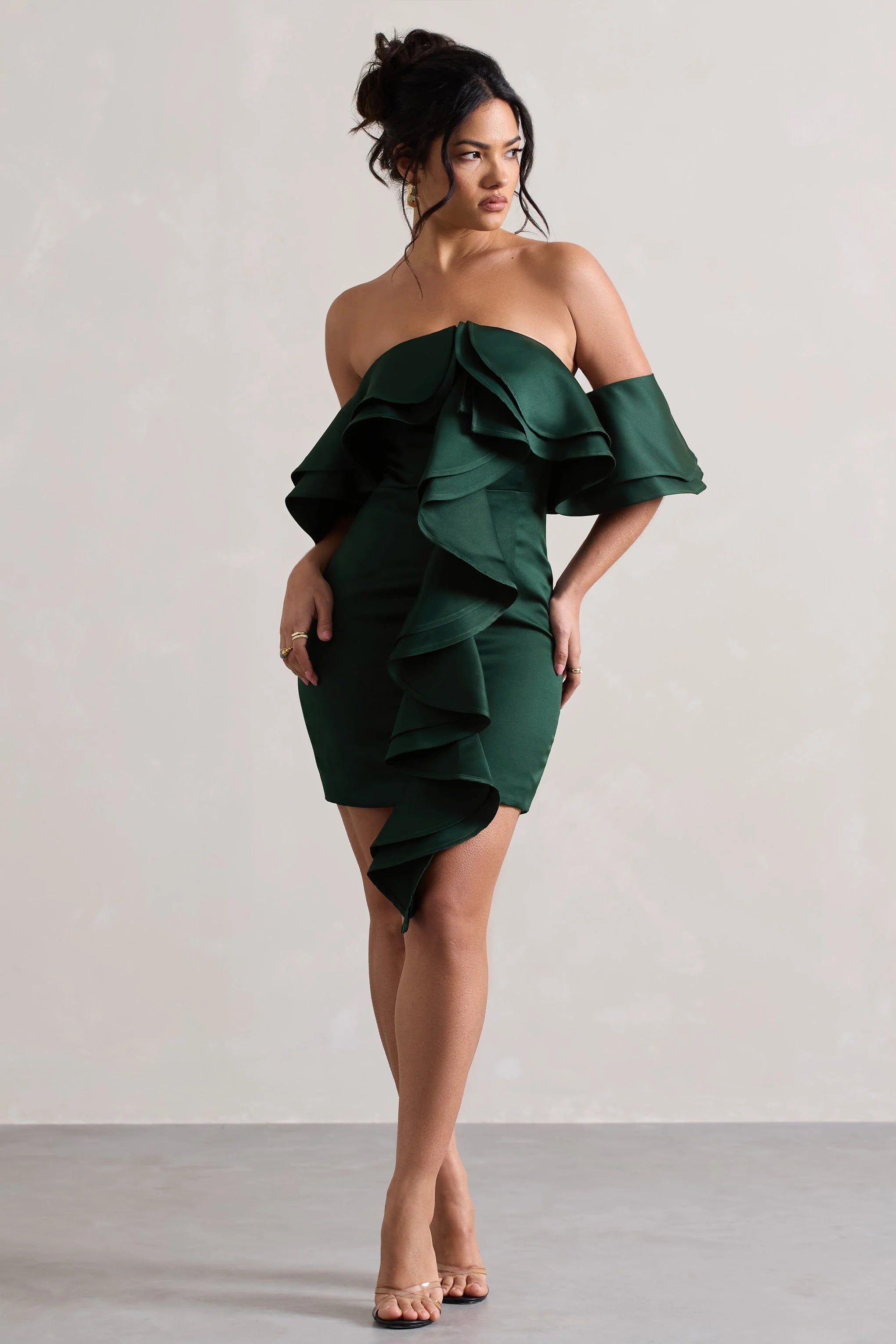 Defined by cascading ruffles, Aspen has everything you need to stand out from the crowd. Arriving in a rich bottle green shade of our premium heavy satin, this bardot mini dress is an enchanting option for any upcoming birthday soirée or cocktail party. Give Aspen's neckline the attention it deserves by styling it with a sleek bun at your next event.