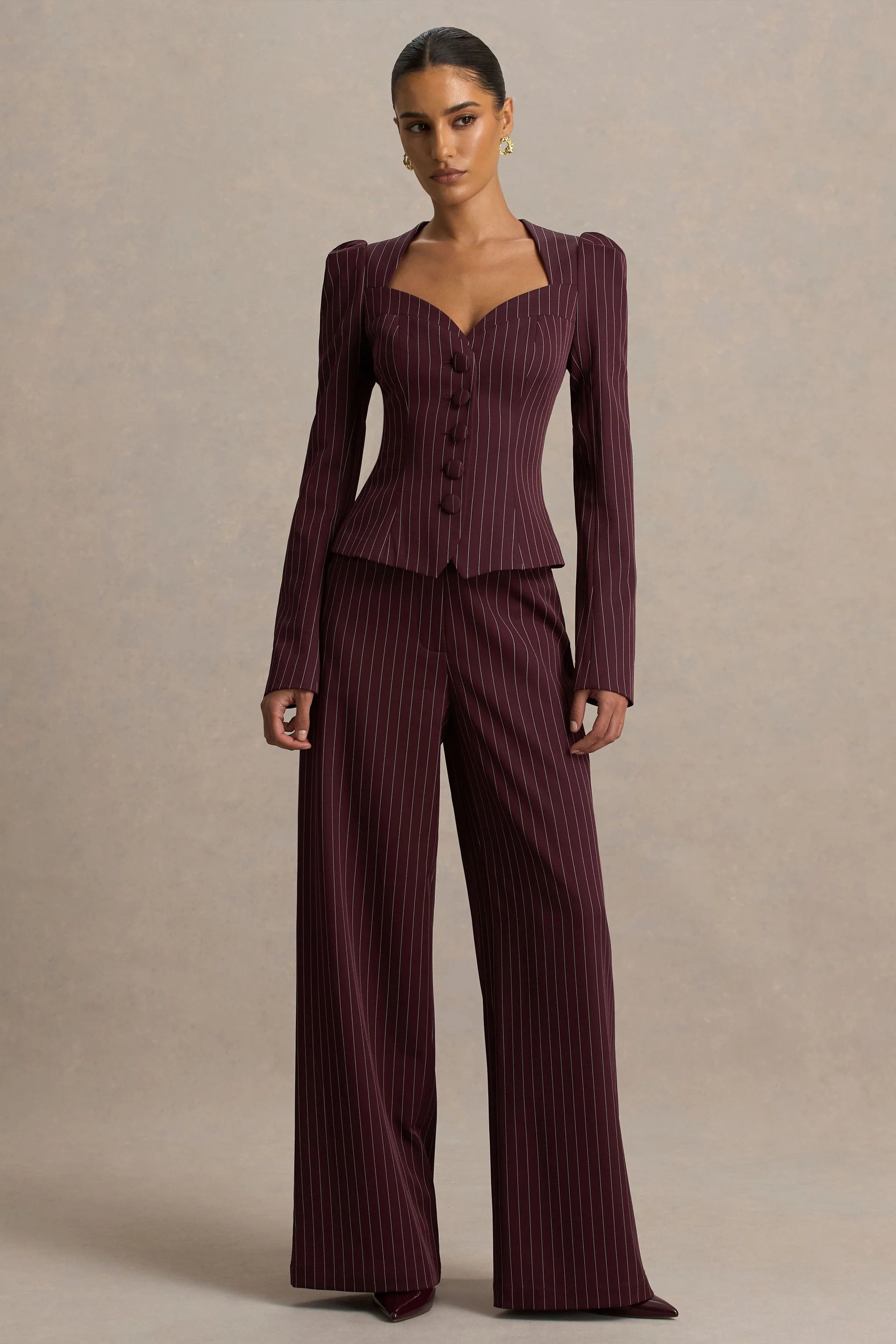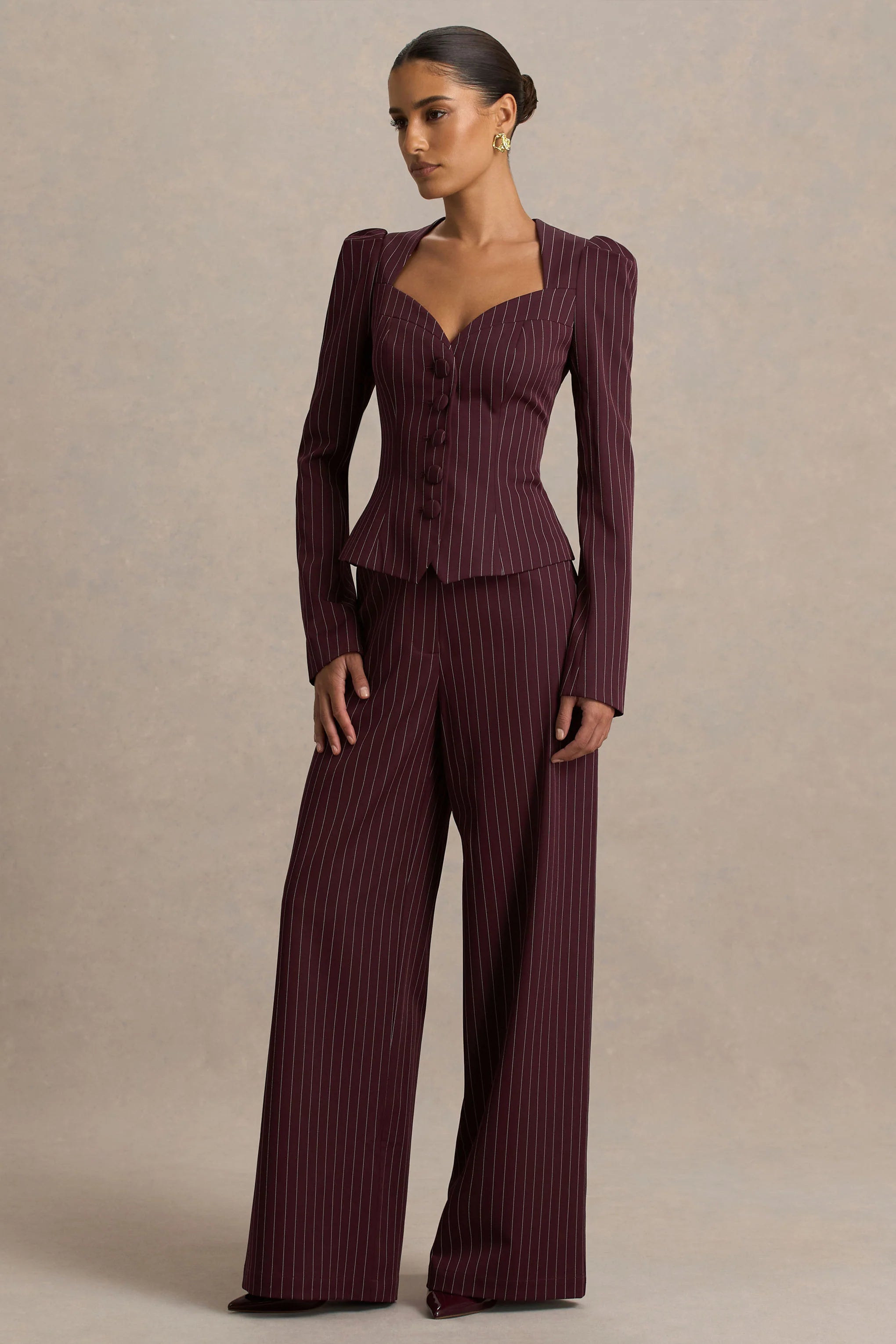 Sharp, tailored, and undeniably chic, Asteria is a power piece designed to redefine occasion dressing. Cut from our premium burgundy pinstripe woven fabric, these trousers contour the figure with a flattering fit before falling into a sleek wide leg. Belt loops and front pockets add tailored detailing, making them as functional as they are stylish. Style with our Lana top for a polished co-ord look that takes you from business meeting chic to date night glam.