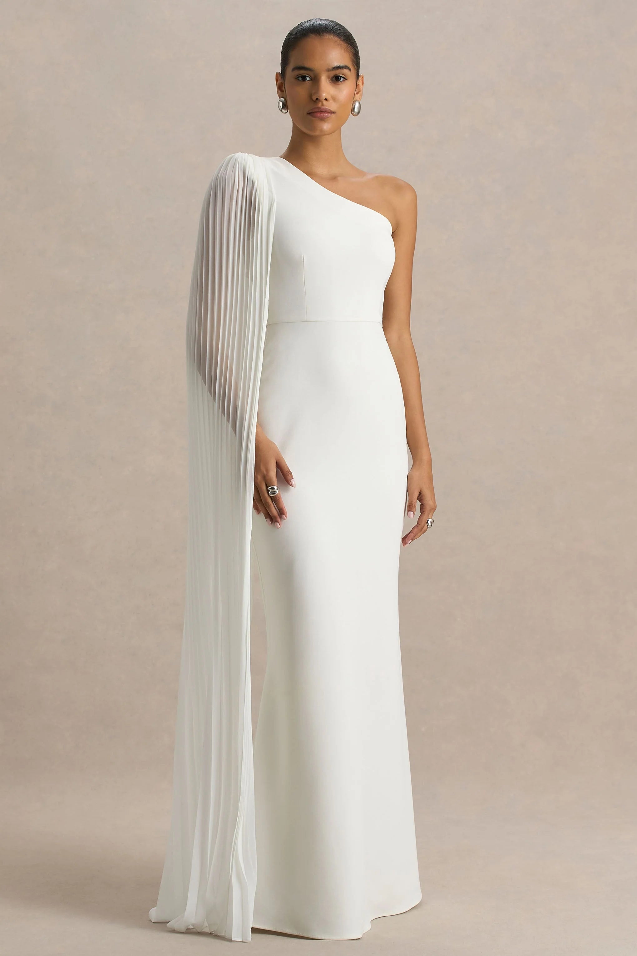 Command attention in Athens, a show-stopping statement for your next VIP moment. Cut from our premium scuba crepe in a fresh white hue, this elegant maxi dress embodies modern glamour. The asymmetric neckline adds a sculptural edge, while the long pleated cape sleeve drapes with dramatic sophistication. Designed to sculpt your silhouette and elevate your presence, Athens is made for making an unforgettable entrance.