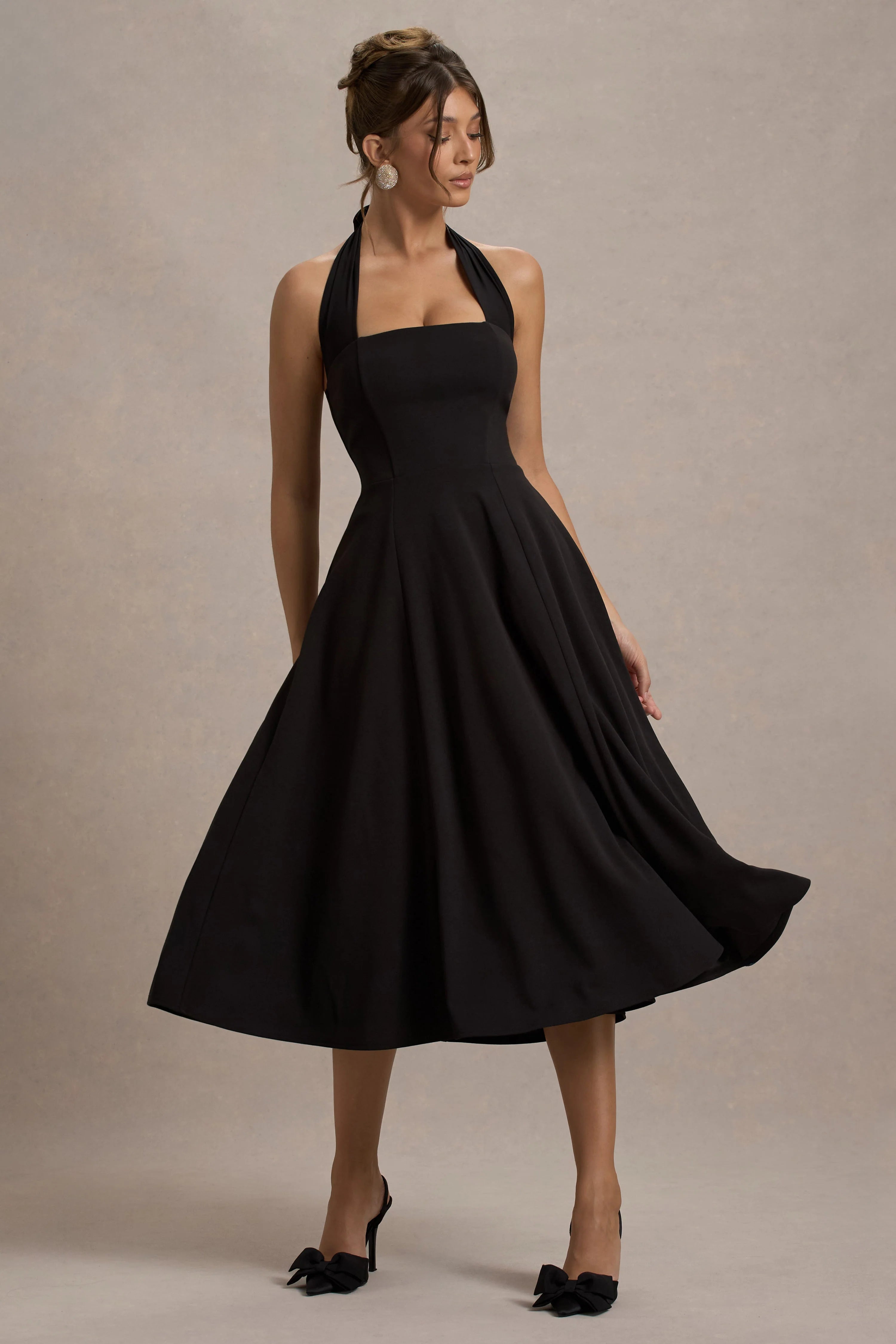 A stand-out staple, every girl needs an LBD like Auburn. Expertly crafted in a premium scuba crepe, this black midi dress is detailed by a self-tie mesh halter and ethereal skater skirt.