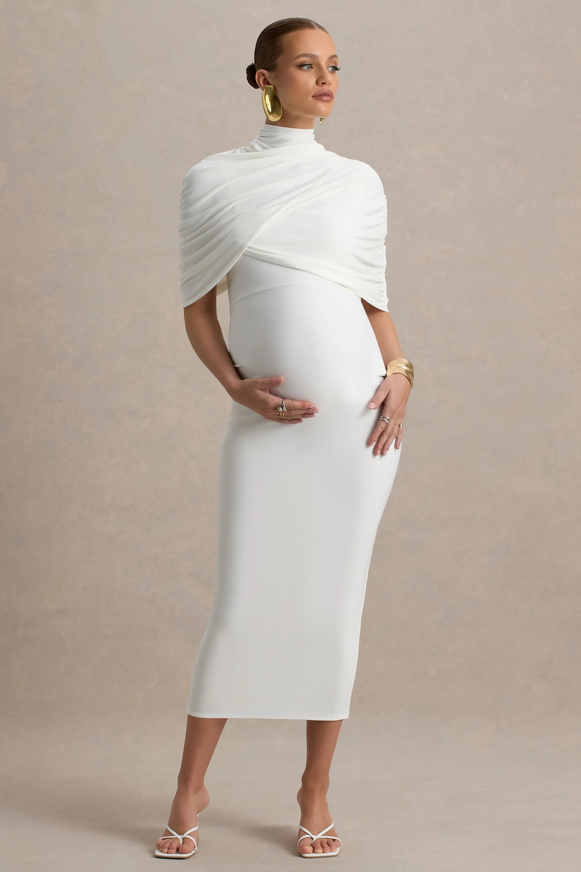 Exude effortless elegance and grace in Augustina. Crafted from our premium stretch jersey, to sculpt your silhouette, this white midi dress is the perfect statement maker for your next special occasion. Designed with a chic high neck and cape sleeves, this piece is the epitome of sophistication. Finished with expertly placed ruched detailing to flatter your figure, in Augustina you will feel as good as you look.