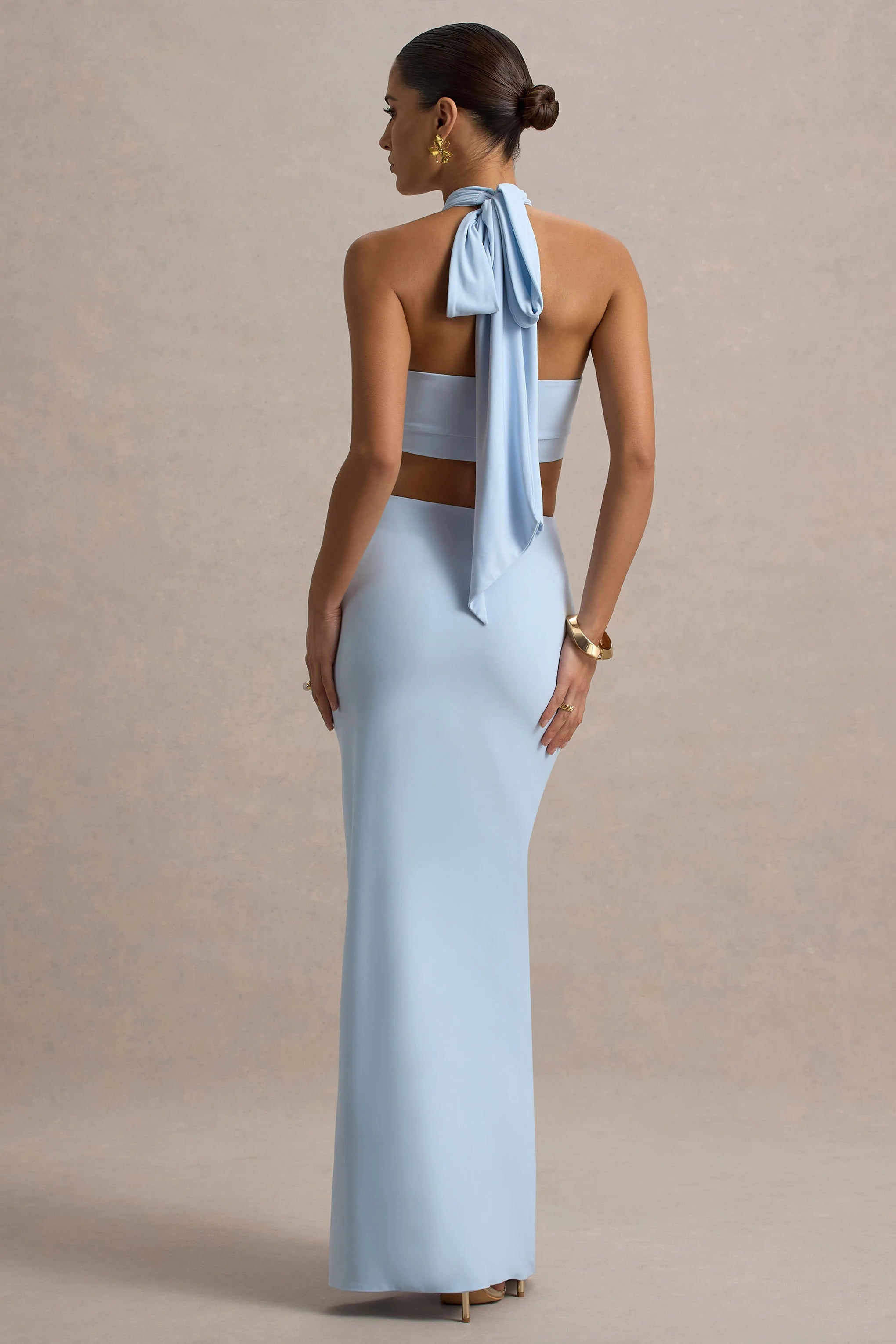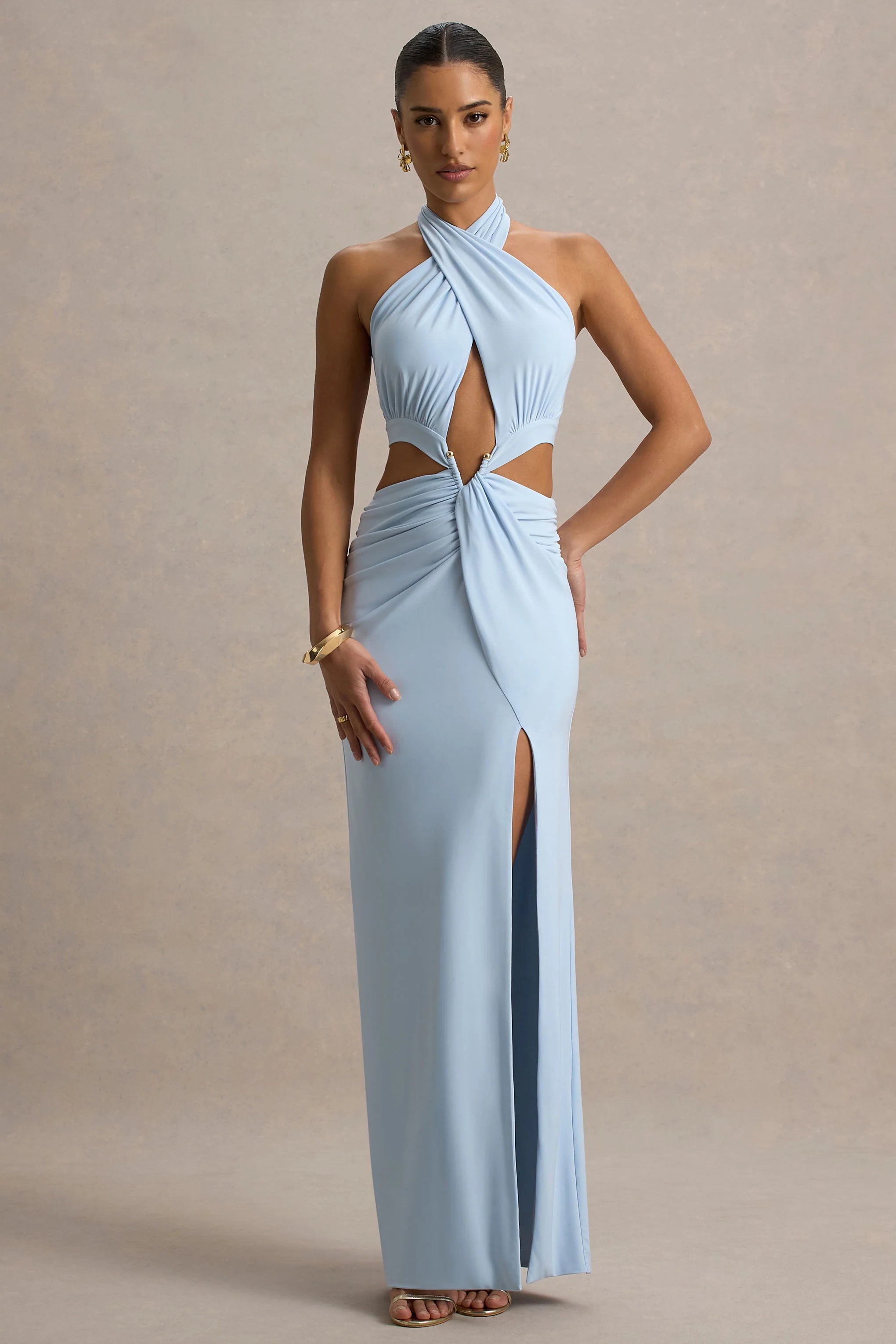 Step into the room and let your Aura do the talking. Designed to command attention, this show-stopping maxi is cut from our signature premium stretch jersey, in a rich powder blue hue. This dress will sculpt your curves with effortless elegance. The halter neckline features a functional tie for a customizable fit, while the daring body cut-outs and a a luxe metal detail at the waist create a cinched hourglass silhouette. Style with sleek heels and let your presence speak for itself.