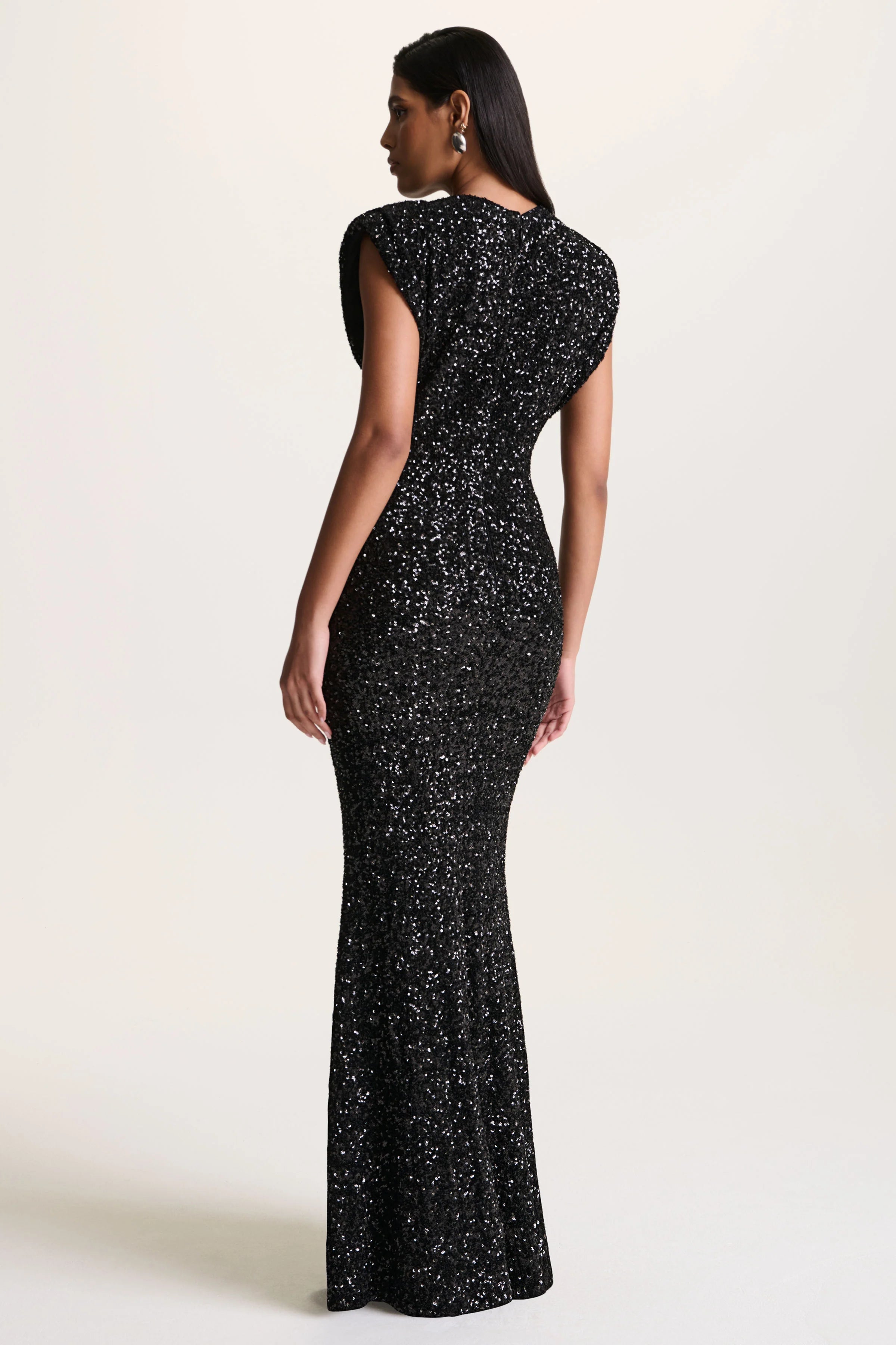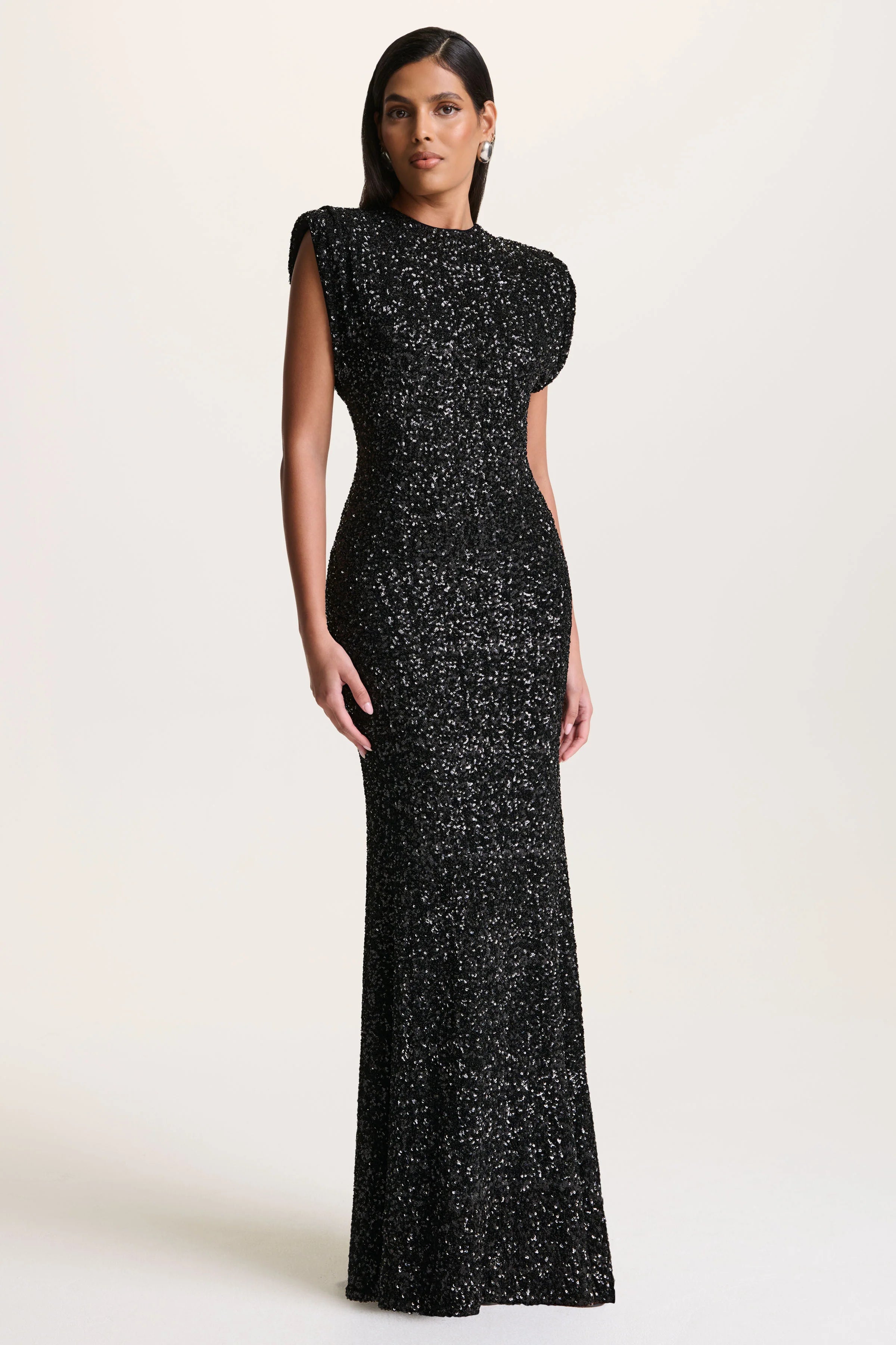 Aurah is the definition of modern glamour with a bold edge. Crafted from our premium black sequin, this maxi dress glitters with every move while sculpting a sleek, flattering silhouette. The crew neckline and cap sleeves keep the look refined, while strong shoulder pads bring a striking, structured finish. Floor-sweeping in length, Aurah is made for statement moments and unforgettable nights.