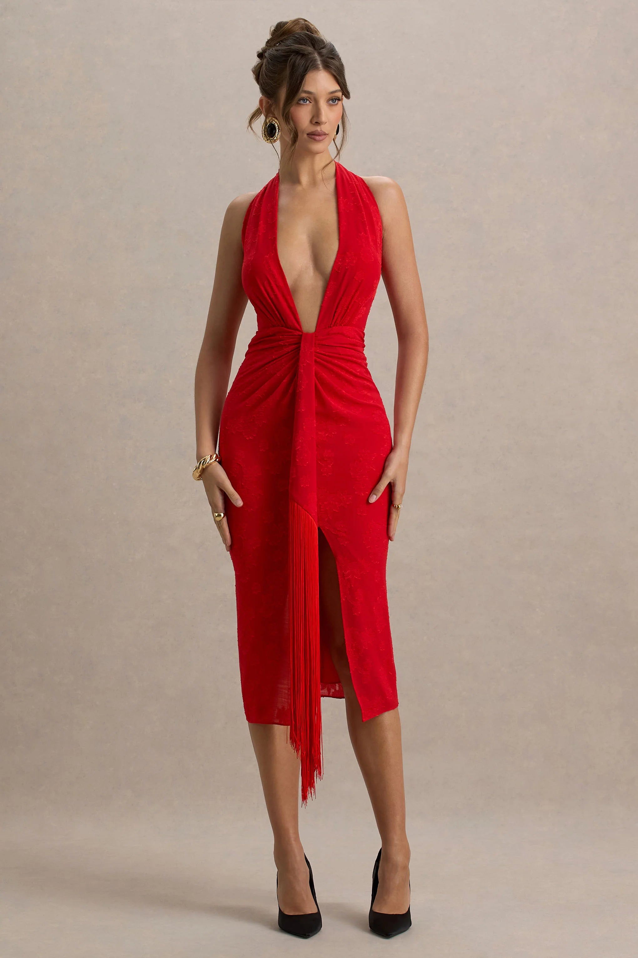 Make a fierce statement in our head-turning Auria dress. This midi is curated from a blend of our premium satin devore and fringe, in a bold red hue for a stand-out look. Boasting a daring, extreme plunge neckline that beautifully ties at the back of the neck, adding delicate detail to this piece. Finished with a striking sash and intricate fringing, this midi moves elegantly with every gesture. For evenings that call for dancing, Auria is the perfect choice.
