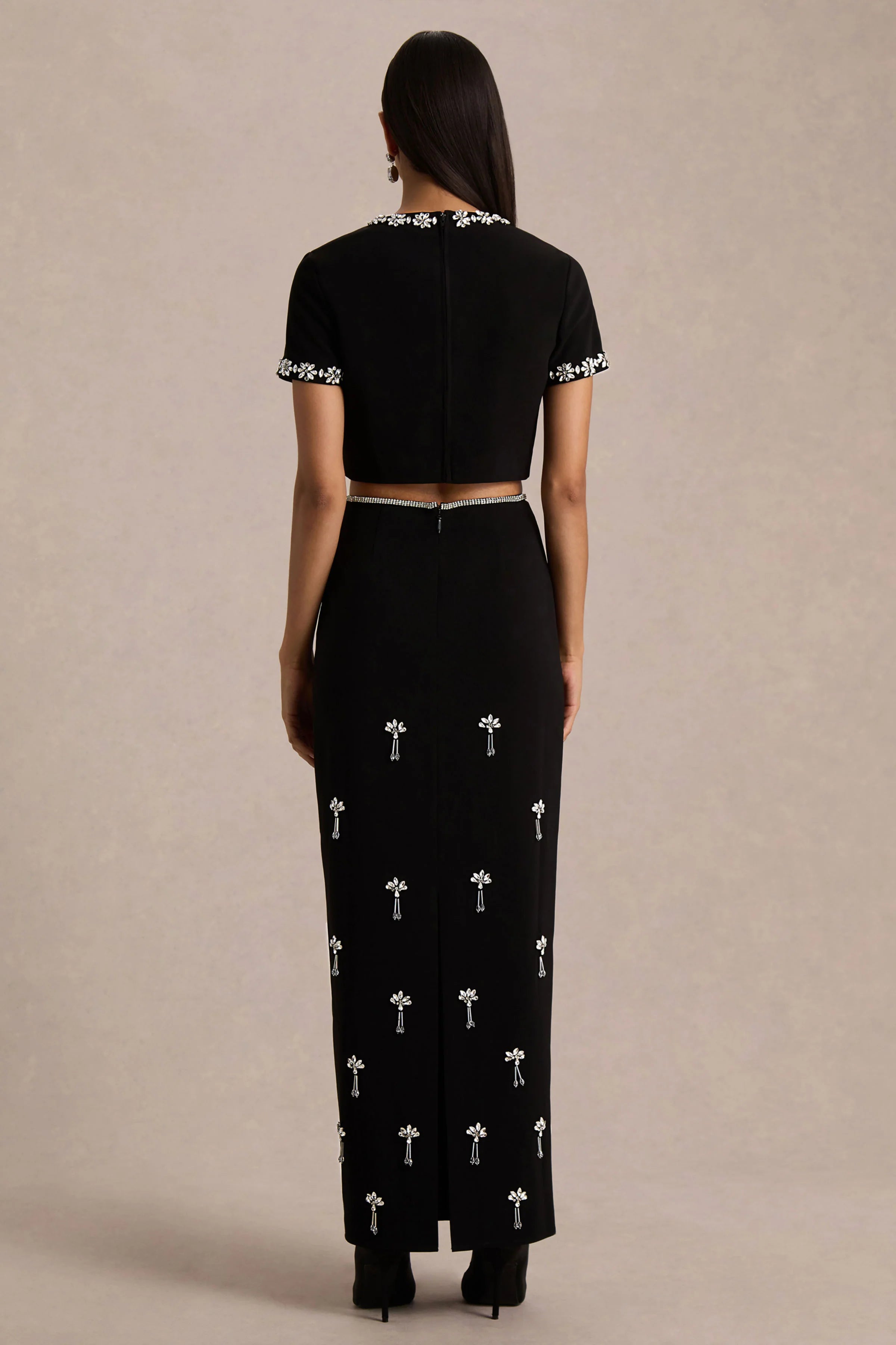 Step out in effortless elegance with the Aven. Crafted in our premium black crepe, this maxi skirt features a flattering silhouette that drapes beautifully. The hand-embellished waistline adds a touch of glamour, while delicate hand-embellishments throughout elevate the look seamlessly. Designed with a centre-back split, it allows for movement and a subtle hint of allure. Pair with our Salma top for a look that exudes chic sophistication.