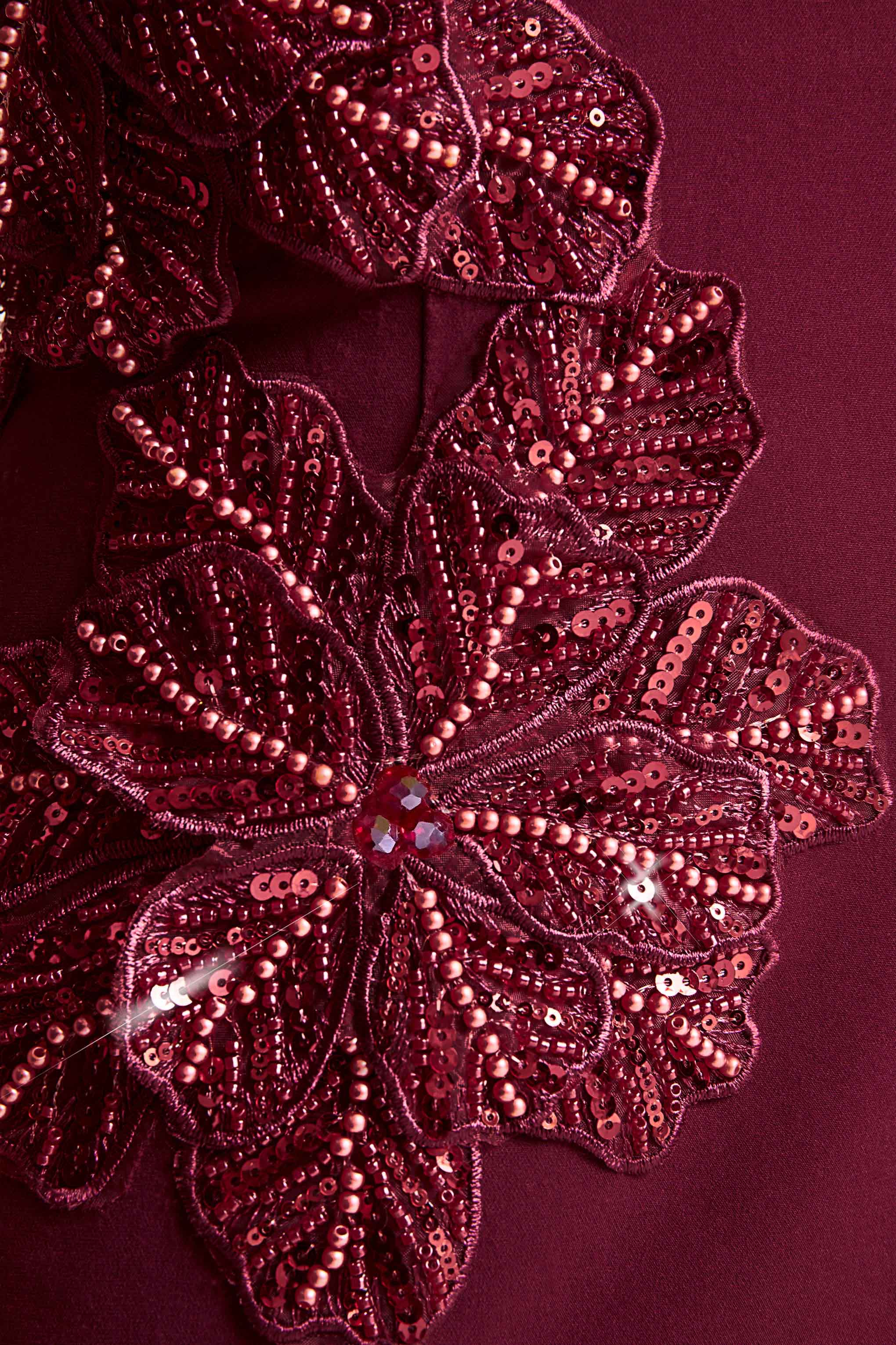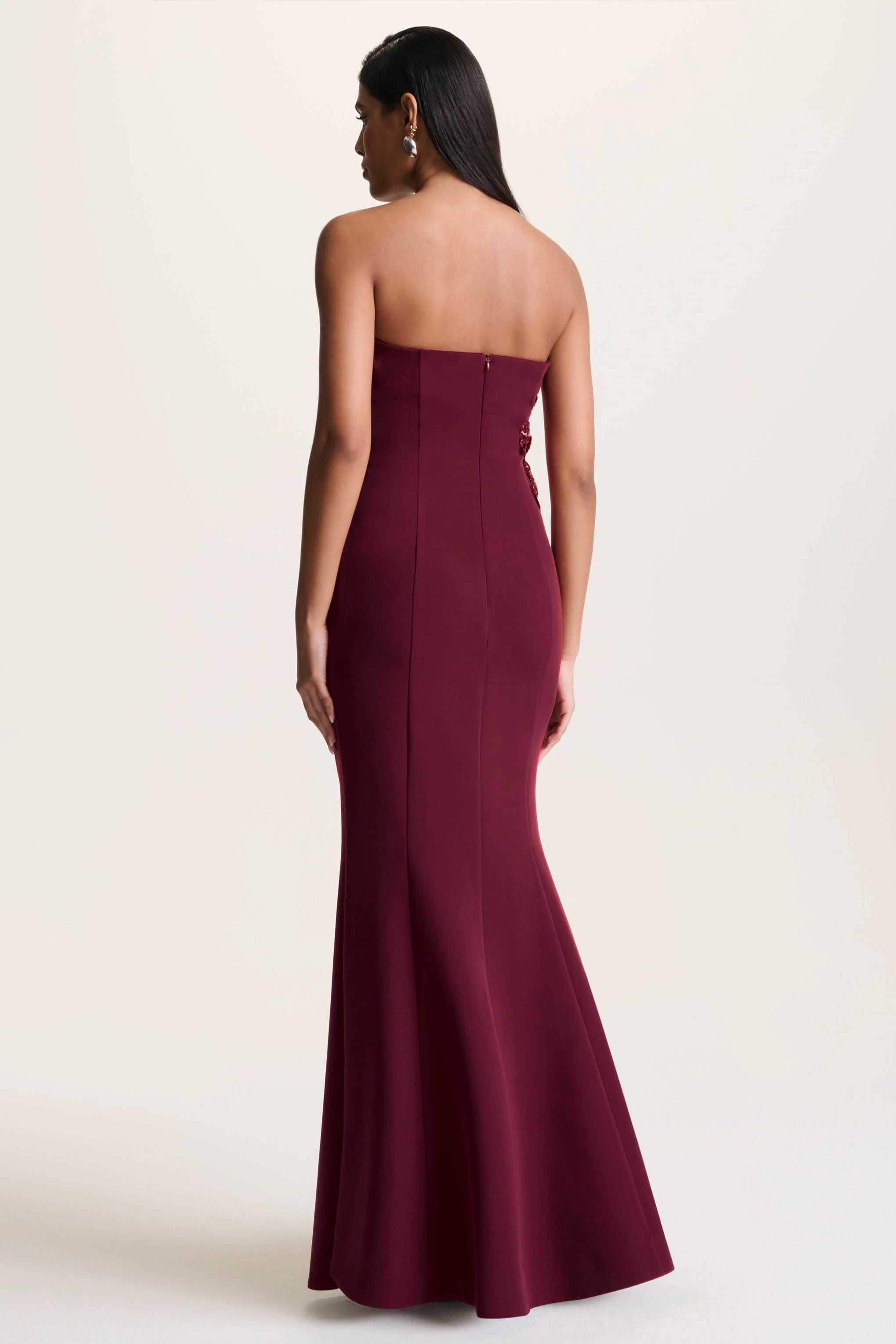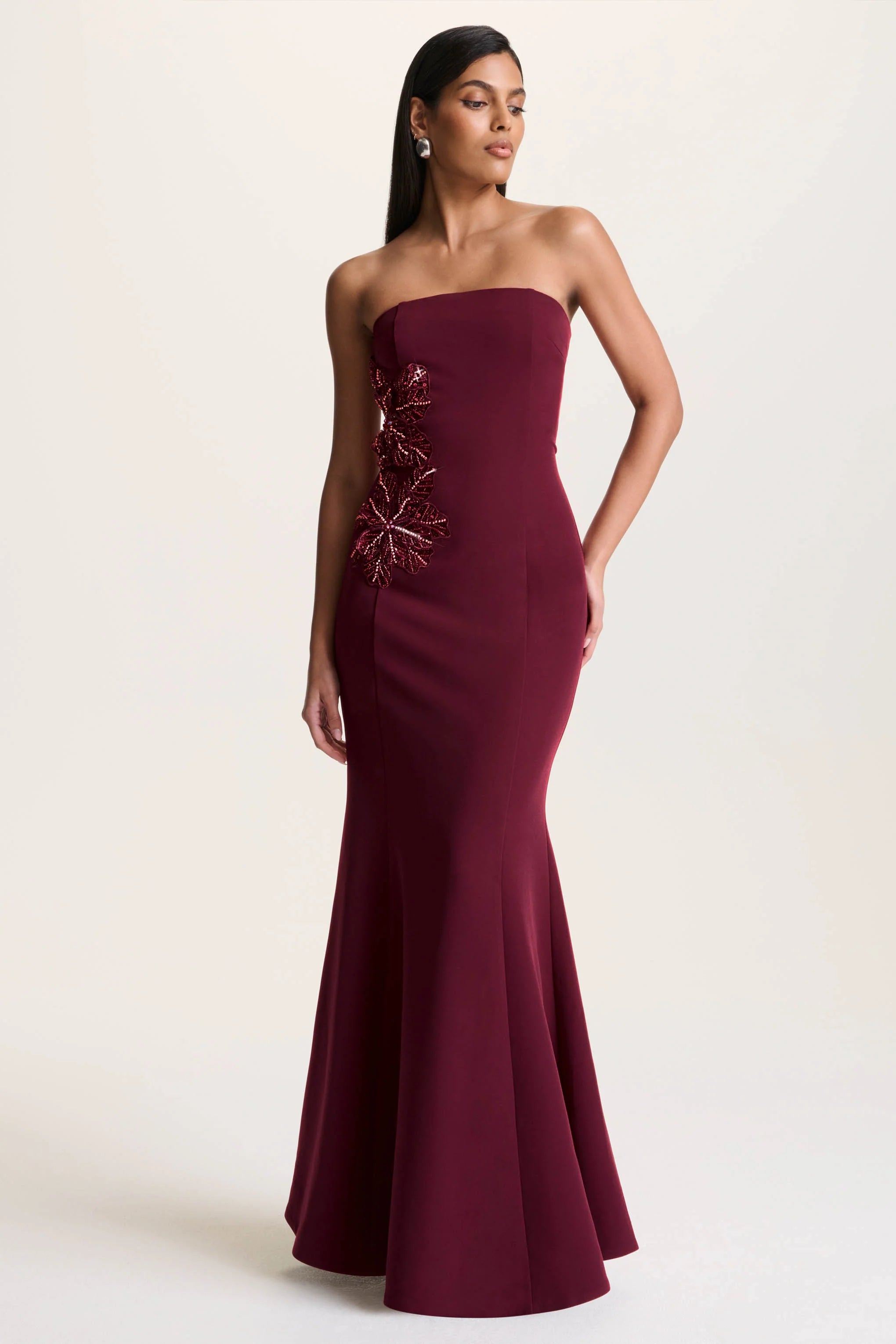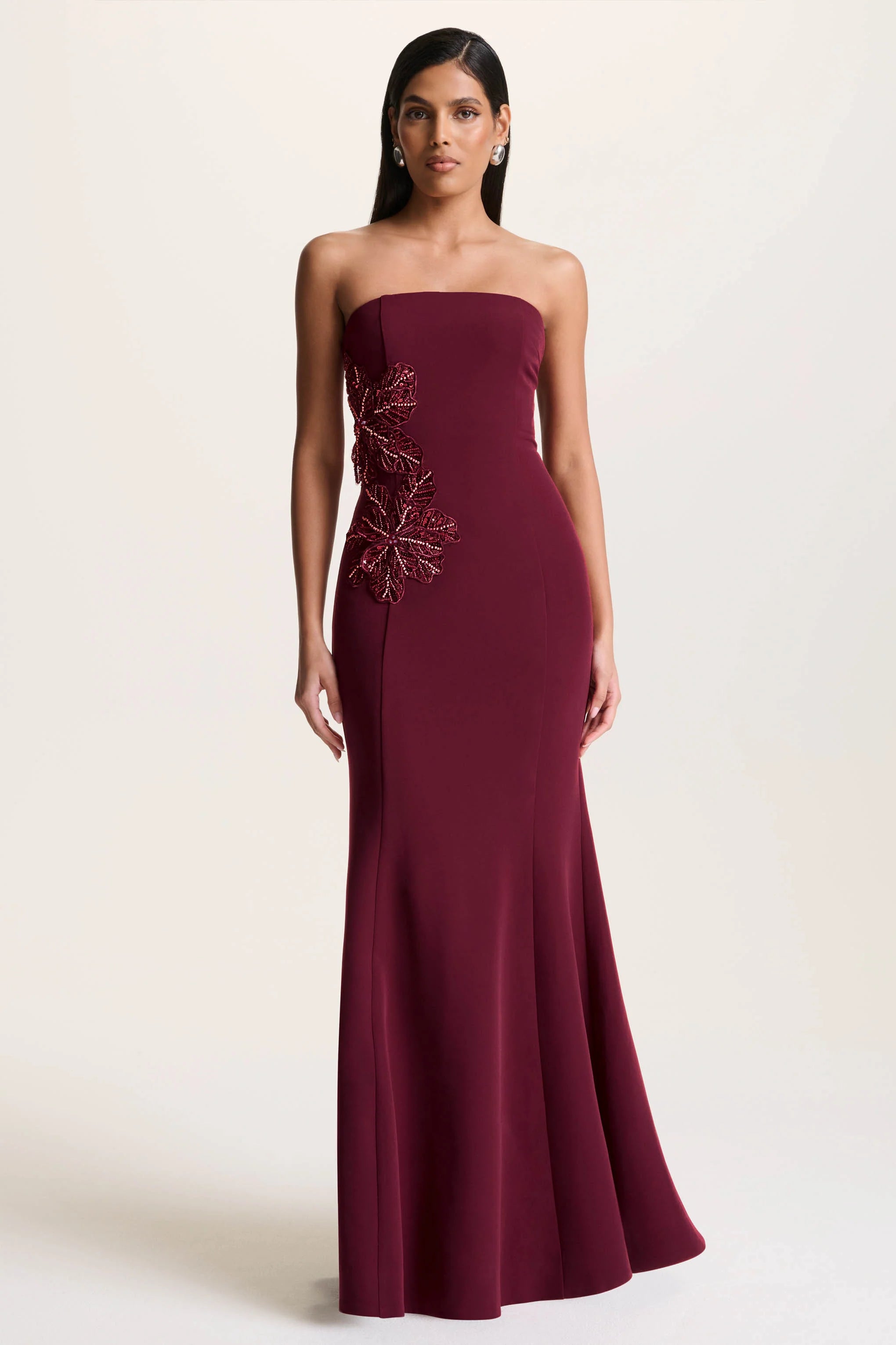 Exude timeless elegance in Aylana, where rich design meets modern sophistication. Crafted from our premium burgundy crepe, this maxi-length silhouette flatters the figure with a sleek, elongating fit. The bandeau neckline creates a striking, contemporary frame, while intricate floral applique detailing adds a touch of drama. This dress is made to turn every entrance into a statement.