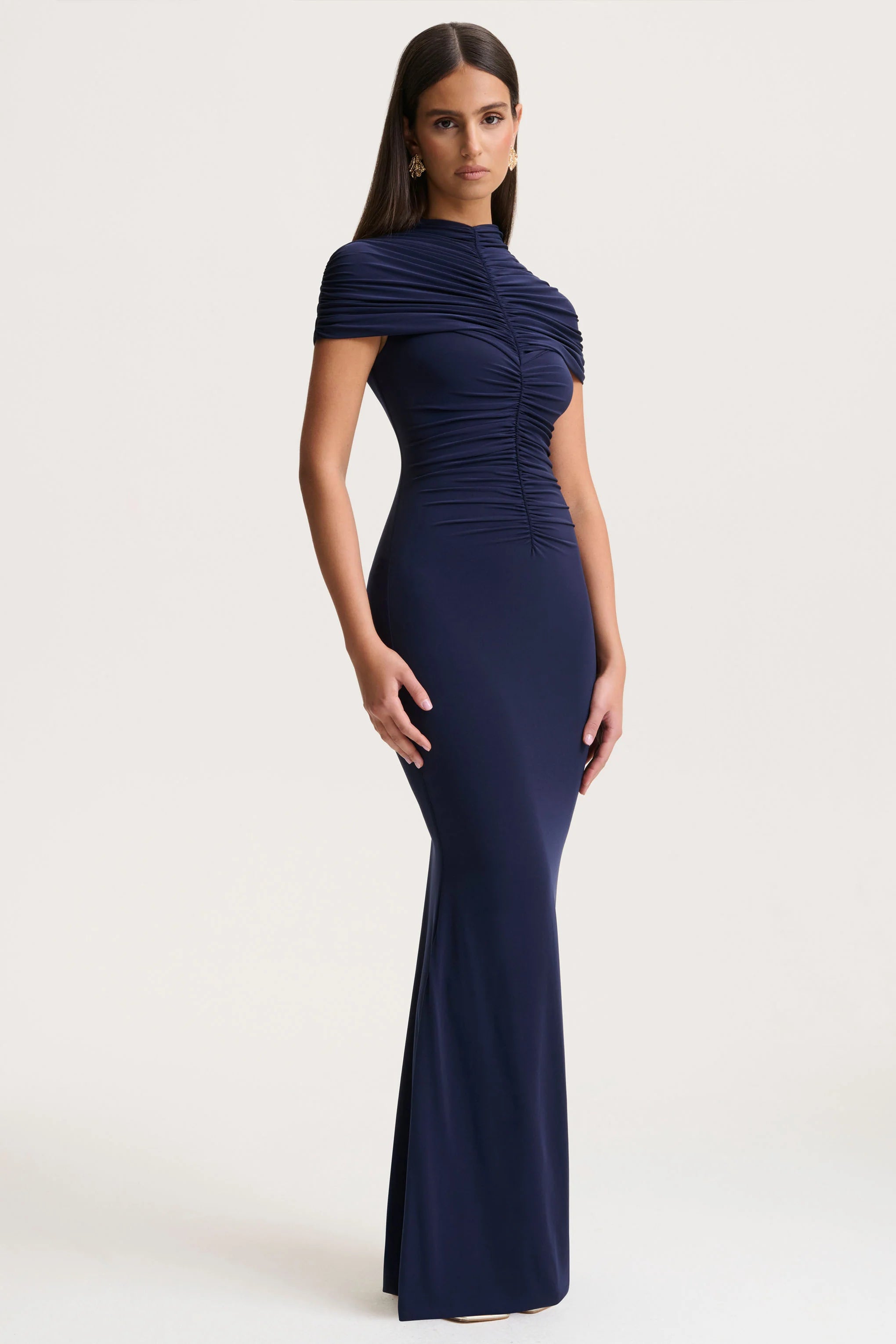 Command attention in Azaria, a gown that embodies elegance with a modern edge. Crafted in rich navy premium stretch jersey, this maxi-length silhouette is both sleek and sophisticated. Featuring a high neckline and gathered detailing that sculpts the figure beautifully, Azaria is the ultimate expression of timeless glamour. Style with sleek heels and gold accessories, for a look that's both parts understated and striking.