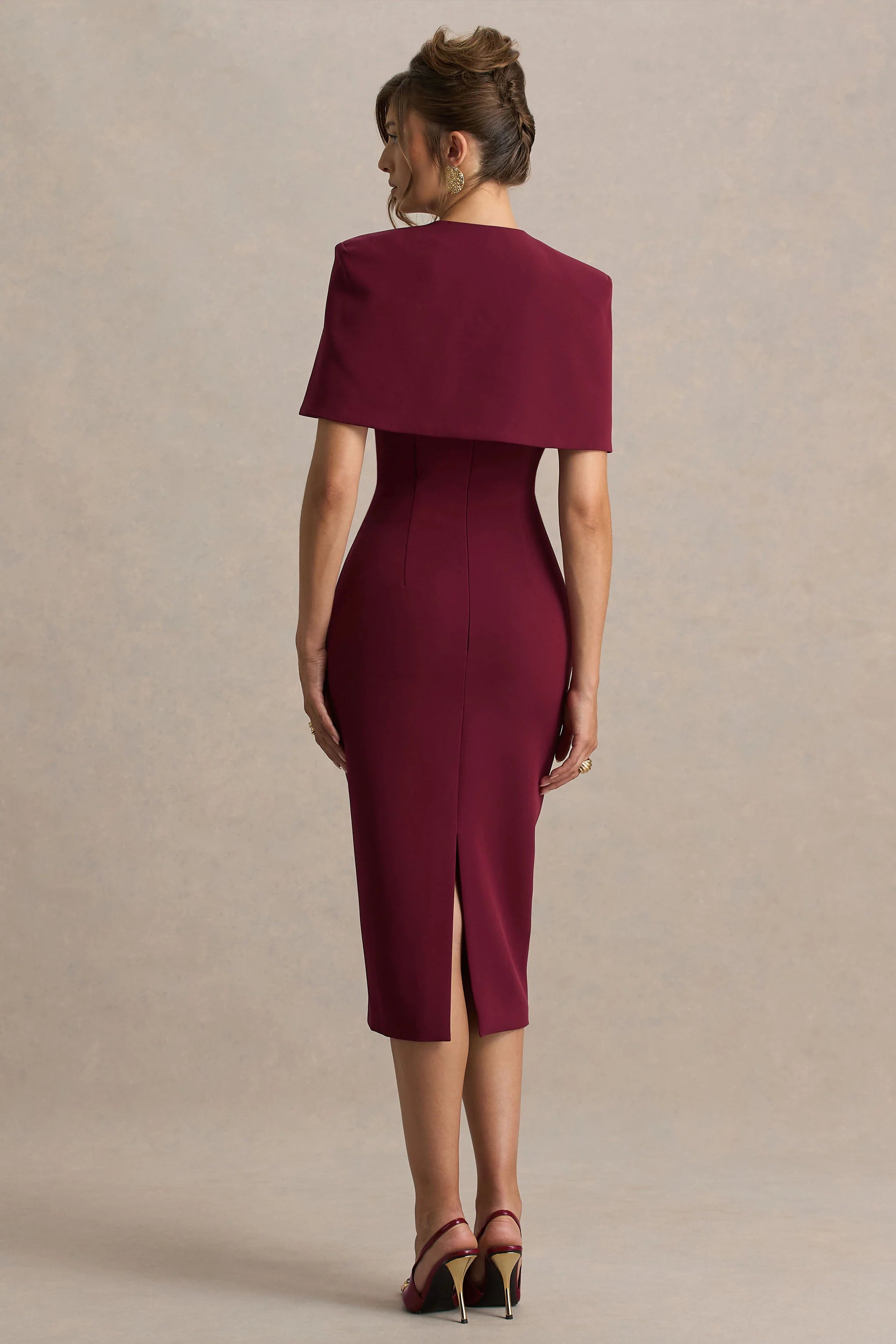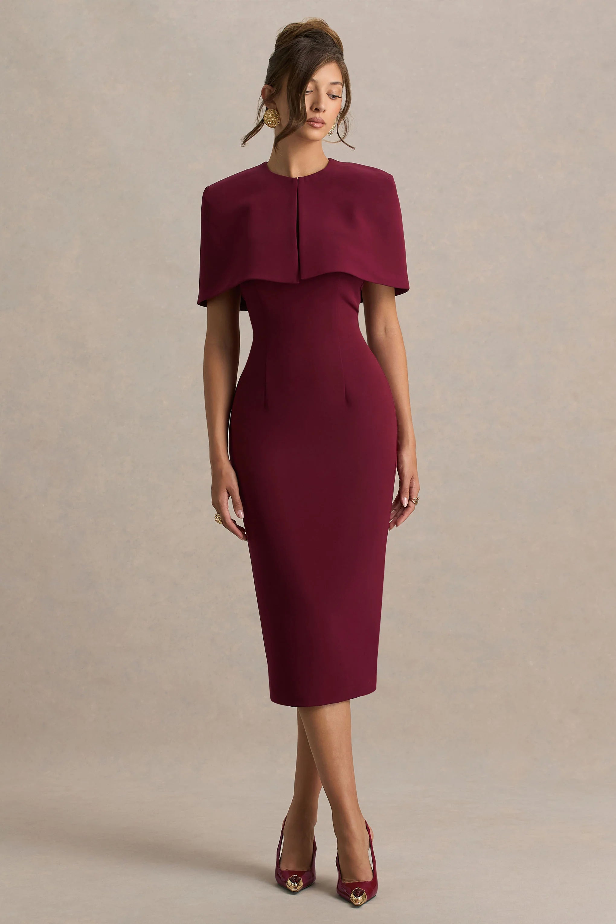 Introducing Baylor, a vision of timeless elegance with a modern edge. Cut from our premium crepe in a deep burgundy hue, this sophisticated midi silhouette is designed to captivate. Featuring a refined round neckline and a chic short cape overlay, the dress is elevated with discreet adjustable cami straps beneath for a flawless fit. Complete with a centre-back split to ensure ease of movement, Baylor is the perfect balance of drama and grace.