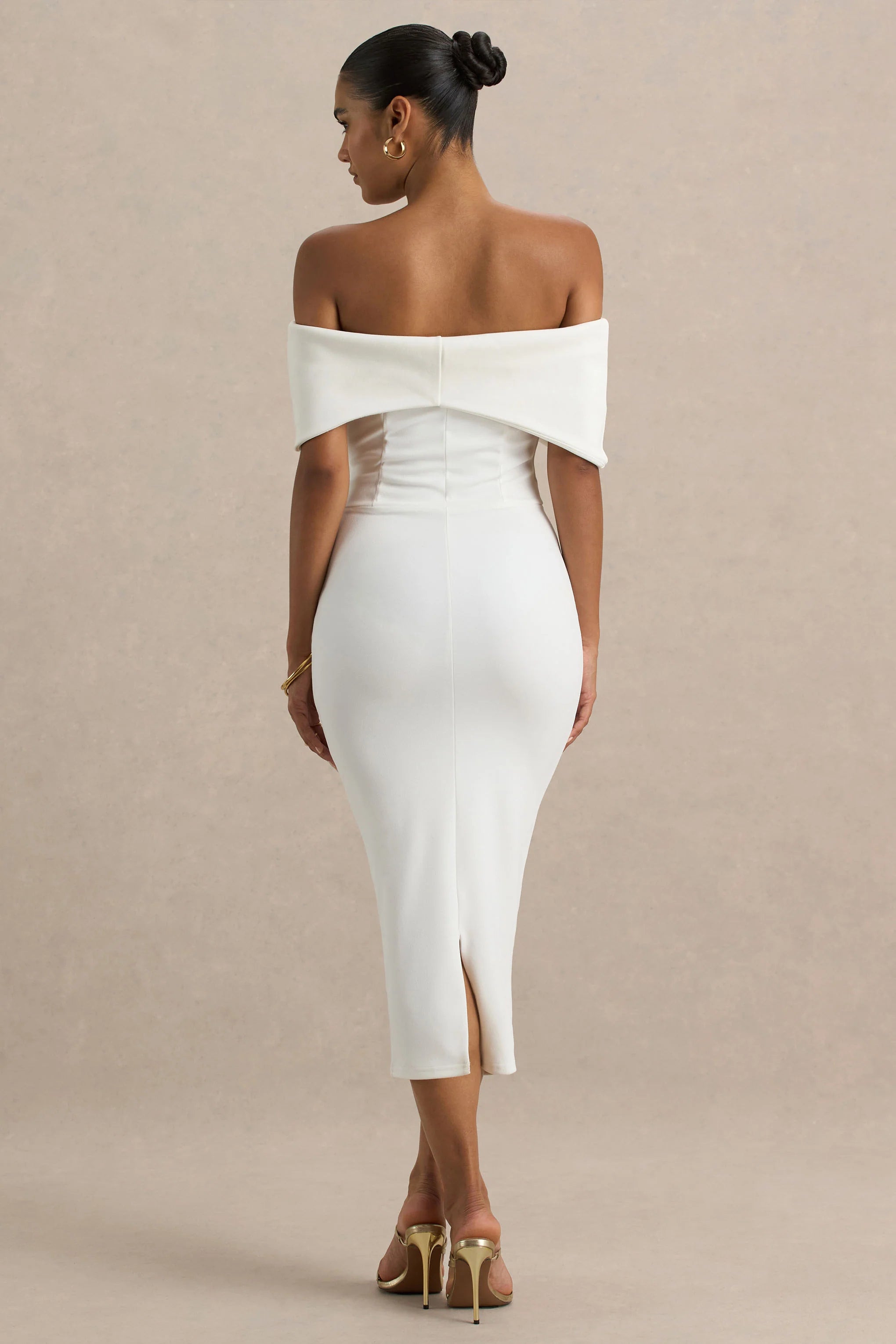 The ultimate showstopper for your next special occasion, meet Bayshore. Designed in our luxurious premium scuba crepe, this sleek midi dress in a soft hue of white is the epitome of sophistication. The statement bardot neckline gracefully frames your shoulders, while the oversized bow detail adds a hint of drama for an unforgettable entrance. Perfect for spring-summer dressed up affairs paired with a glamourous up do.