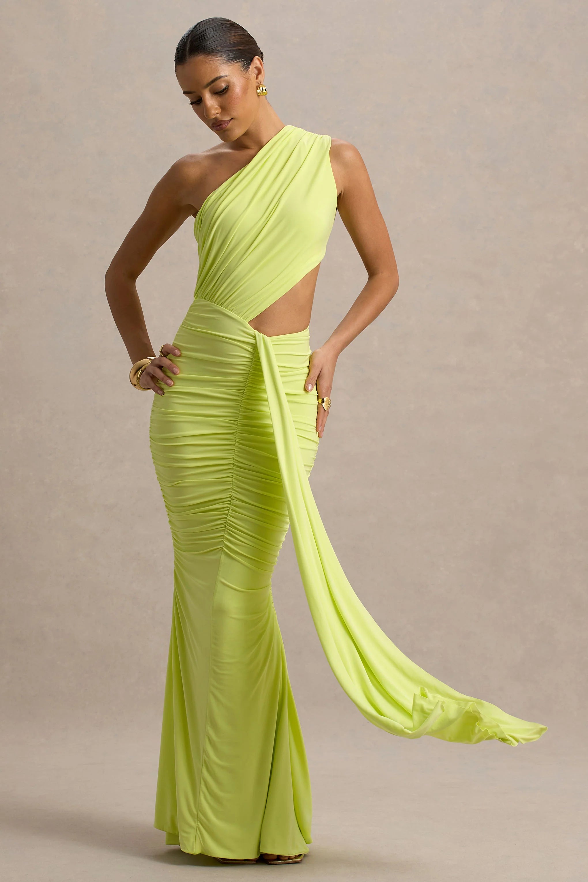 Made for the city nights and everything that follows, add Beline to your wardrobe refresh this season and steal the show whatever the occasion. Crafted from a premium lime green stretch jersey, that's adorned with draped details for a sculpted fit, all eyes will be on you this month thanks to our trending contemporary cut-outs and ruched skirt fit.
