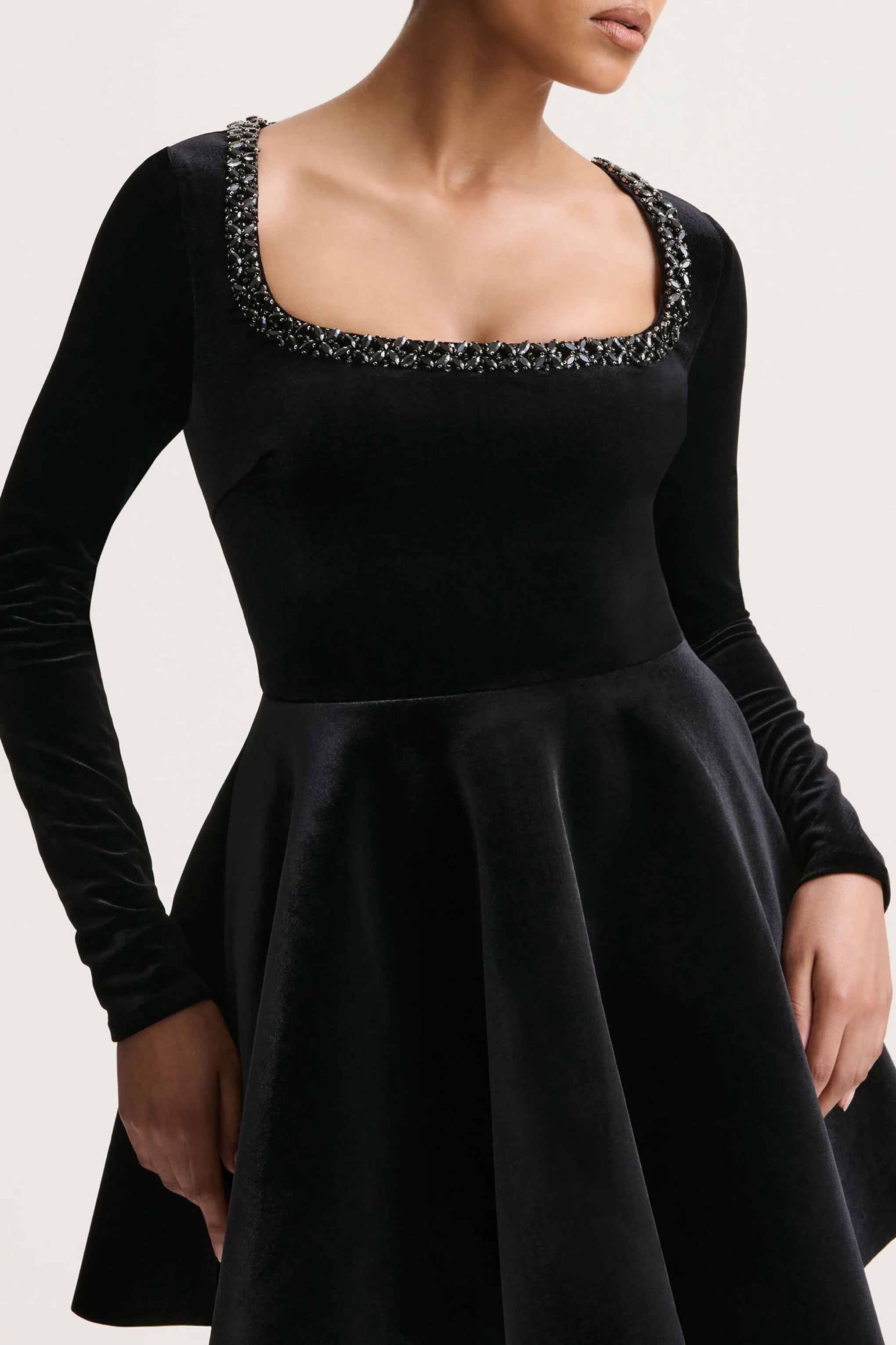 Playful yet elegant, Beloved is here to make an entrance. Cut in a rich black hue of our premium velvet, this mini dress is the perfect statement piece for party season. The square neckline features hand-embellished detailing that catches the light gorgeously, whilst framing the decolletage. Finished with a skater skirt that moves beautifully with every gesture, in Beloved you will captivate any room you walk in.