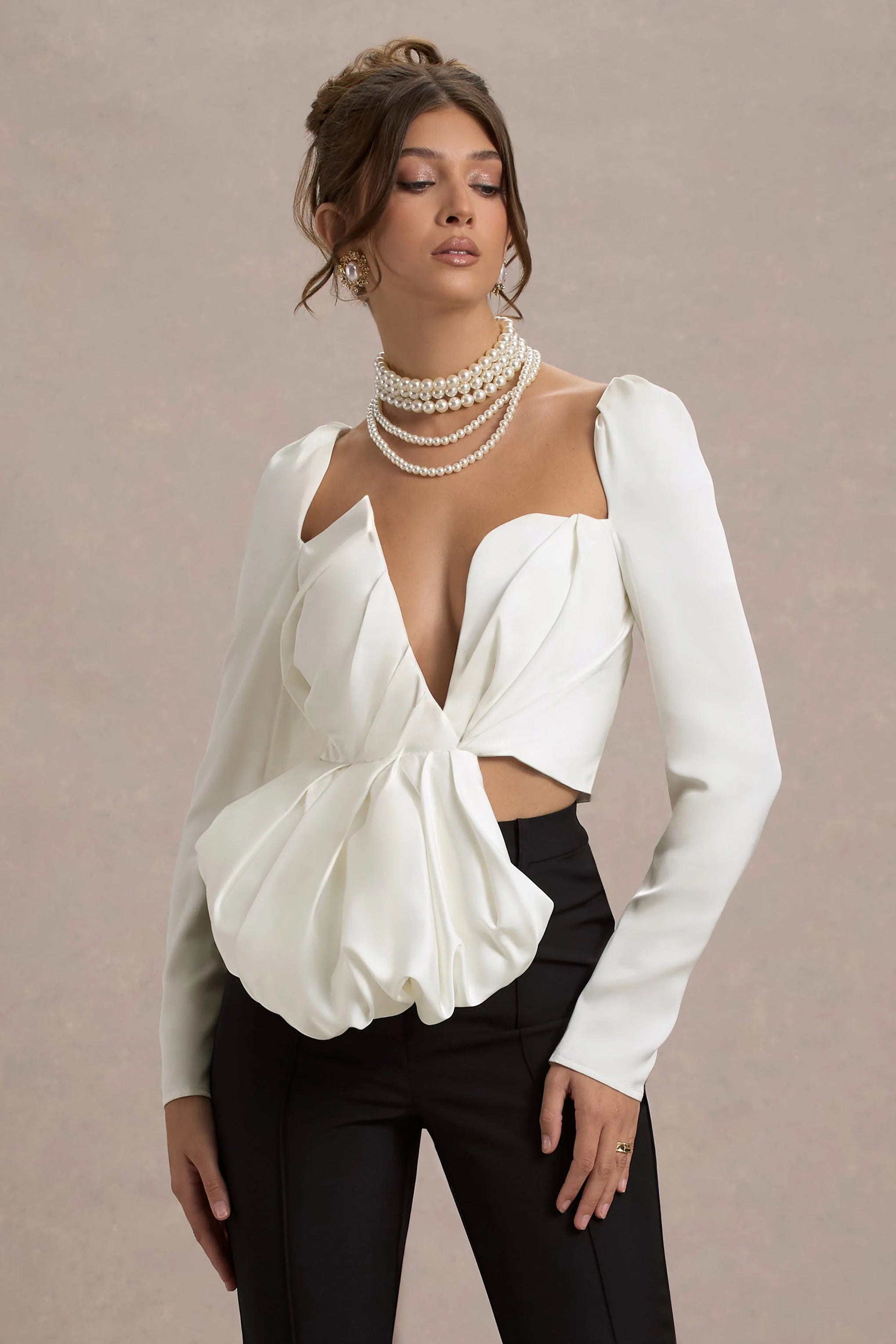 Ideal for spontaneous outings, Bensley is a must-have for any wardrobe. Made from our premium shimmering ecru satin, this elegant piece boasts long sleeves and a plunging neckline. The standout feature is the charming ruffle detail which sits gracefully at the centre of the waist, adding a touch of sophistication to this versatile garment.