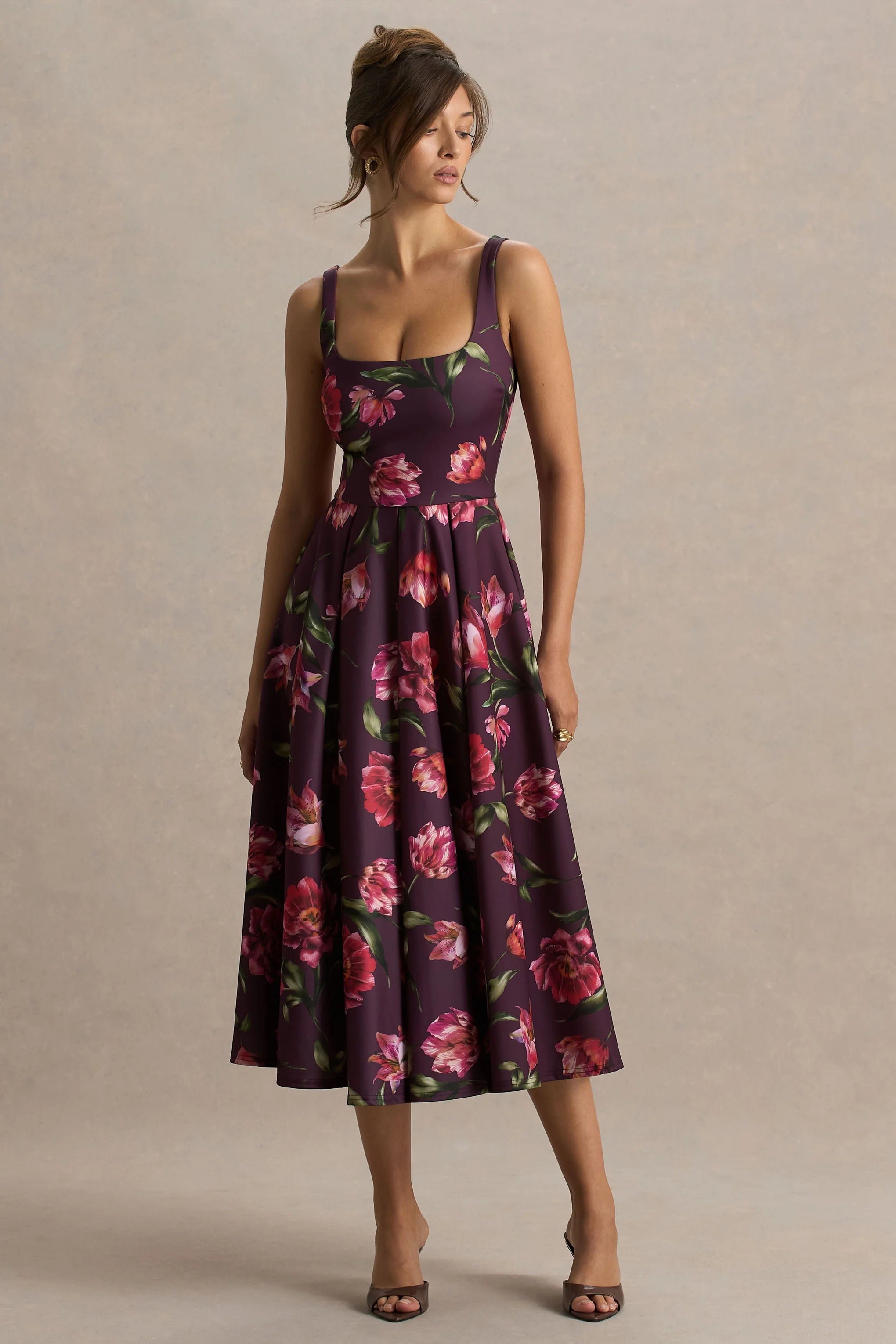 Introducing the perfect timeless addition to your wardrobe, Berta. Crafted in our premium scuba fabric, this midi dress is designed in a burgundy floral print adorned with bold navy polka dots, giving vintage glamour a modern twist. Featuring a flattering square neckline and cami straps, this piece is as feminine as it is striking. The A-line silhouette skims the body beautifully, flowing into a skirt that moves with grace. Perfect for elegant garden parties or statement daytime soirées.