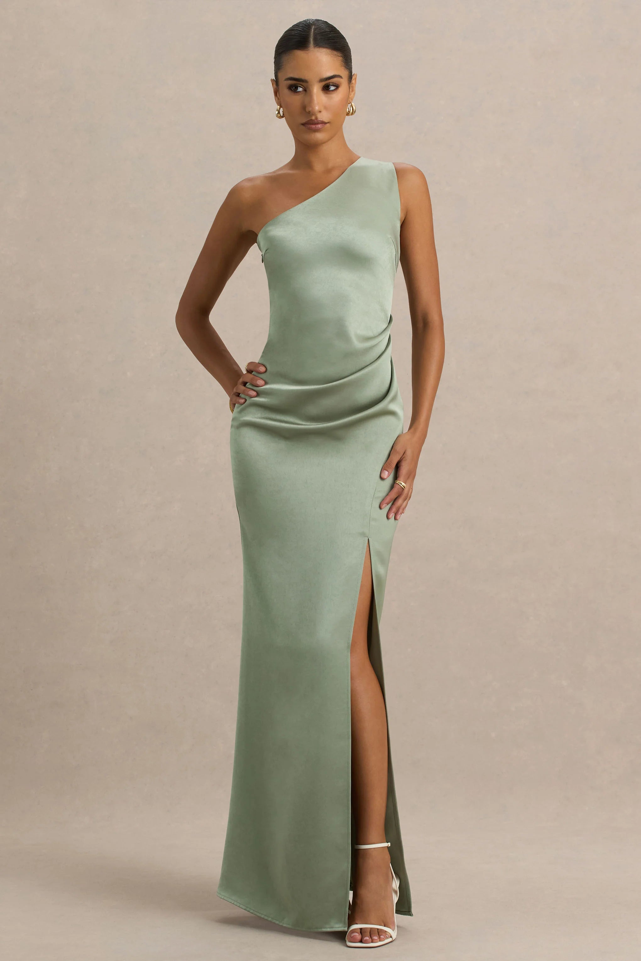 Sleek, sultry and effortlessly refined, Beth is the definition of understated glamour. Crafted from our premium stretch satin in a soft sage hue, this curve contouring maxi dress features an asymmetric neckline that frames the decolletage with elegance. A thigh-high front split adds just the right amount of drama, making Beth the perfect choice for your next occasion, from weddings to evening soirees, in this gown you will make a statement.