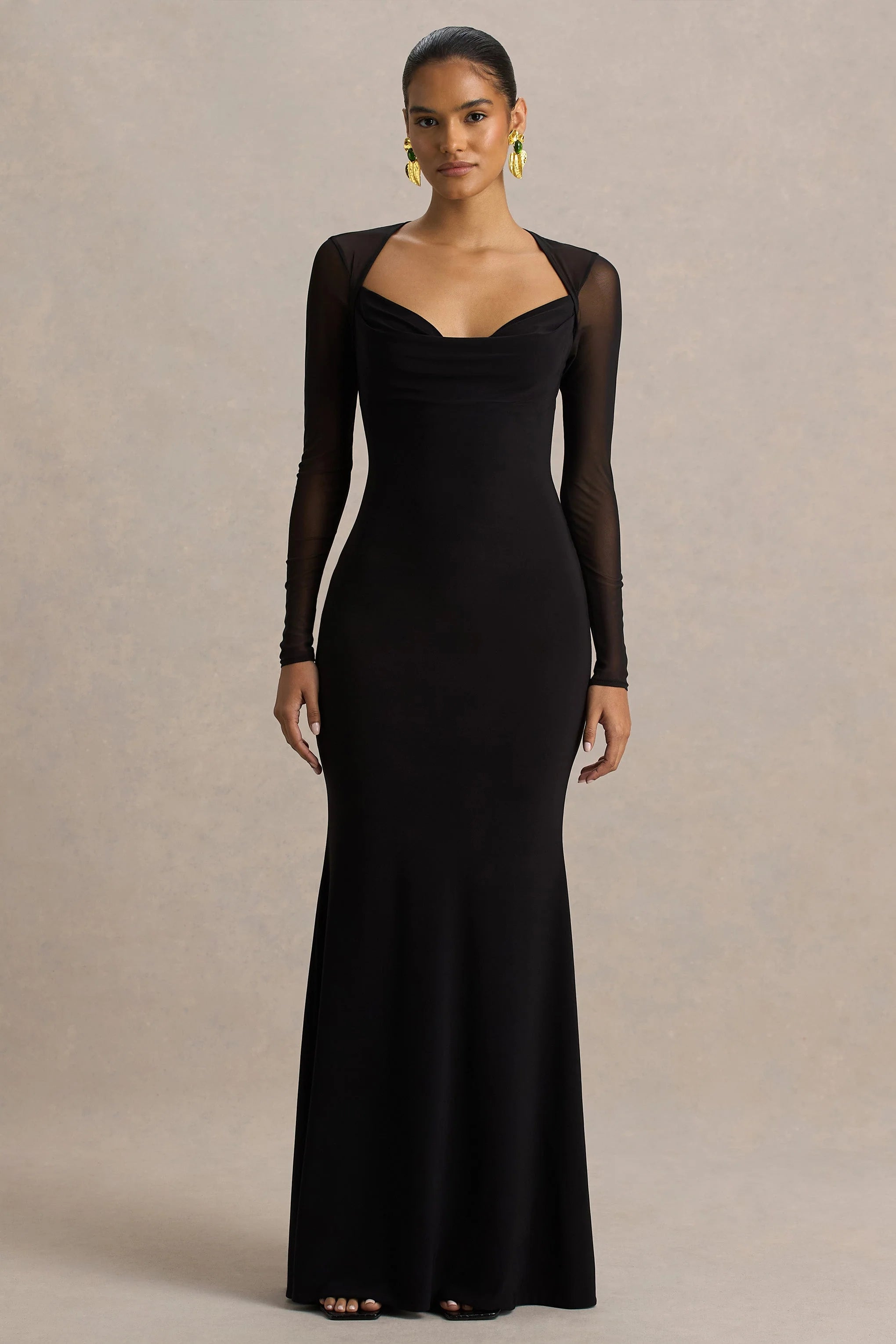 Introducing Bethan, where dark romance meets daring allure. Crafted from our premium stretch jersey with sheer mesh accents, this sculpting black maxi dress is equal parts chic and sophisticated. The soft cowl neckline and long mesh sleeves offer a touch of elegance, while the open back steals the spotlight with its intricate lace panel. Designed to contour every curve and command attention, Bethan is your go-to for unforgettable after-dark moments