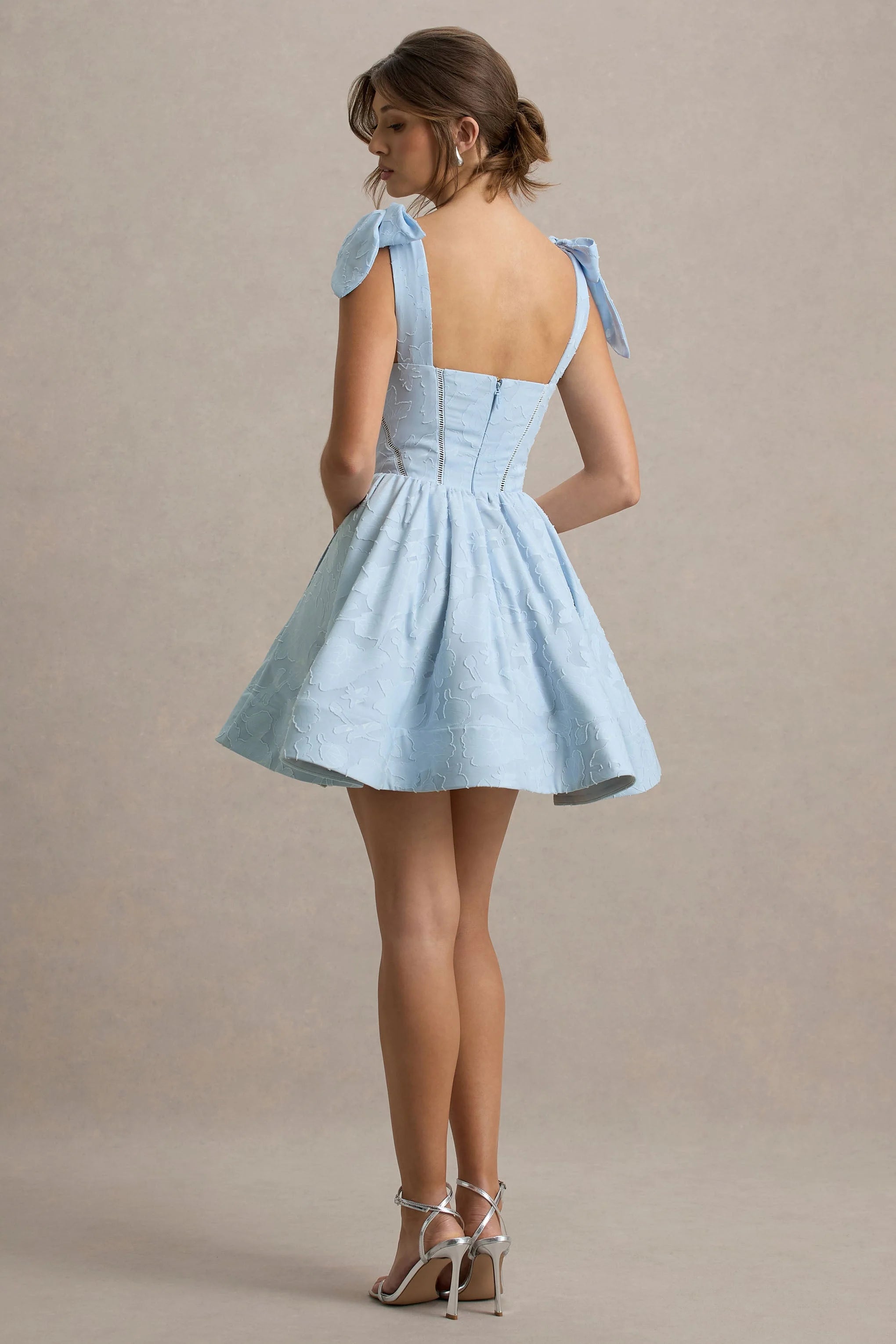 Step into the spotlight with Bethani, a dreamy mini designed to make an entrance. Crafted in our premium stretch crepe and finished with an intricate burnout design in a soft hue of light blue, this piece blends texture with elegance. The square neckline creates a structured, feminine silhouette while the tie detail sleeves add a romantic touch. This piece pairs perfectly with strappy heels and gold jewellery, for gorgeous summer evenings.