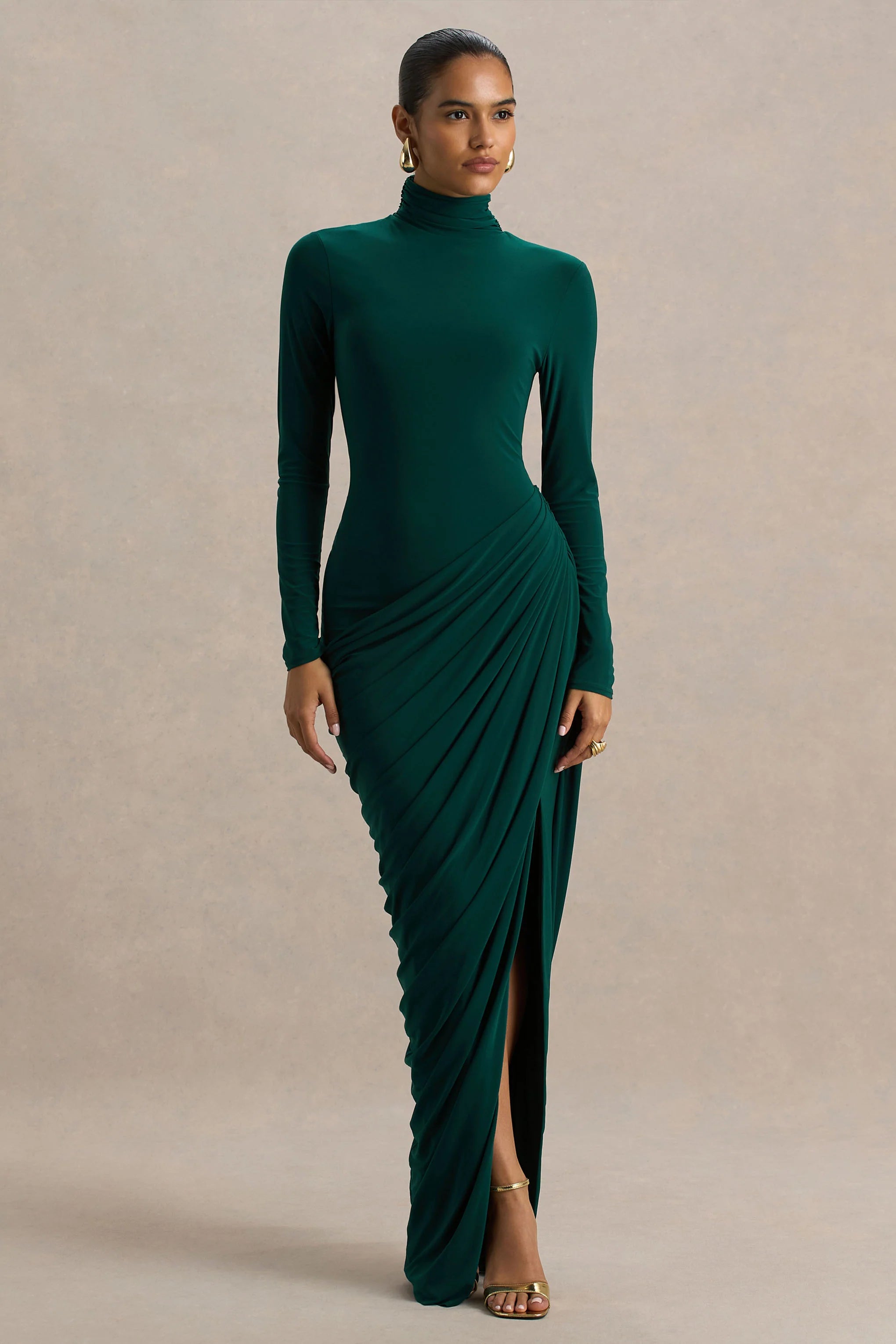 Make an elegant entrance in our latest gown, Betsy. Designed in a rich, bottle green shade of our signature slinky jersey, this maxi dress will sculpt your figure and effortlessly enhance your silhouette. Featuring a chic high neckline and long sleeves that provide add a classic and refined feel to this piece. Finished with a draped detailed, drop waist that flatters your curves, ensuring you exude confidence. The front high-split perfectly balances this piece by adding a sultry edge. Style with bold earrings and sleek heels, for the ultimate black tie look.