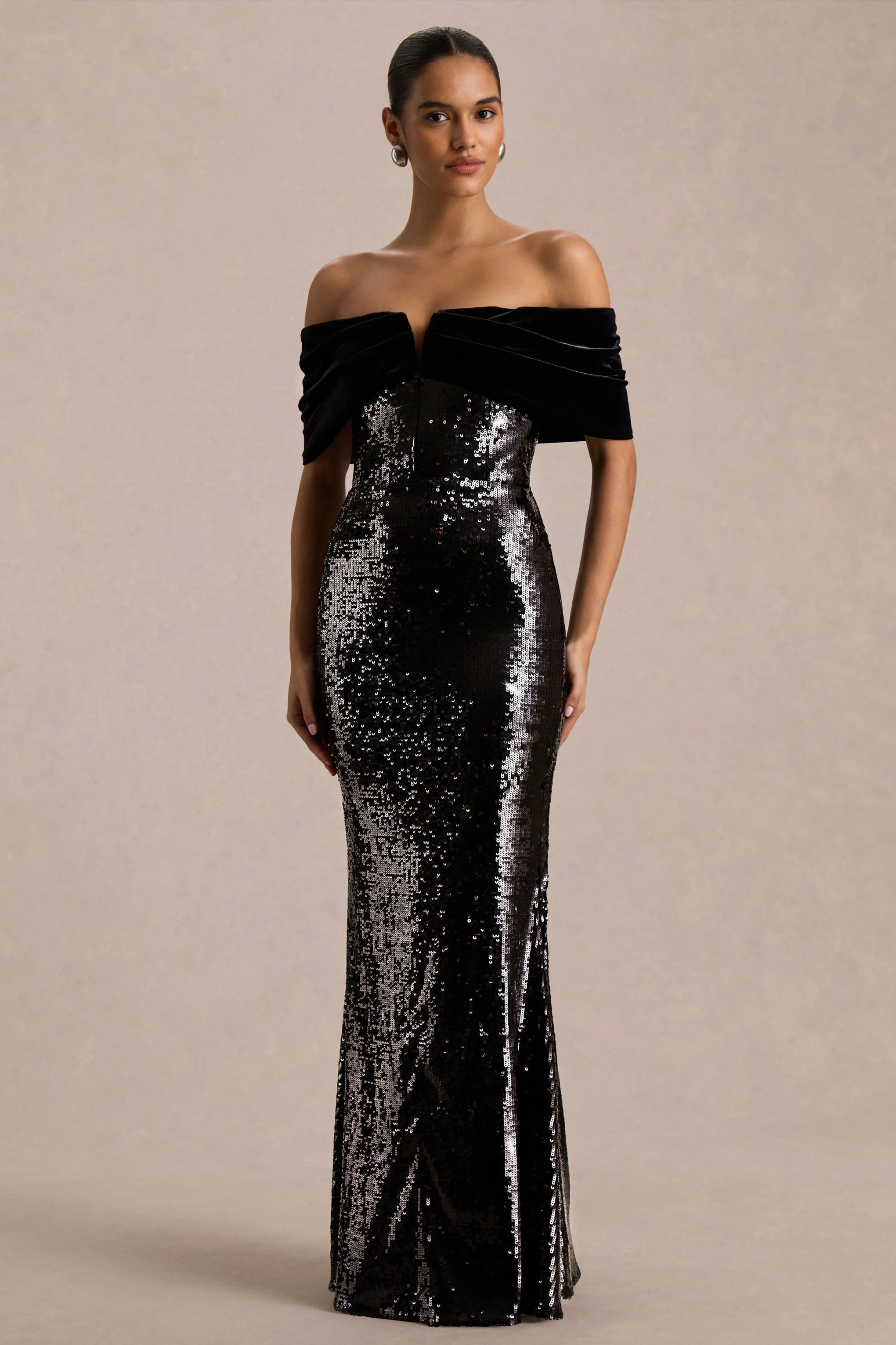 Say hello to Bex, the maxi dress that was made to shine. Crafted from premium black sequin fabric, its floor-length silhouette hugs the figure for a flawless, sculpted fit. The bardot neckline paired with a wired V detail creates a striking, alluring shape that exudes confidence. Bex is your go-to for show-stopping evenings and red-carpet moments.