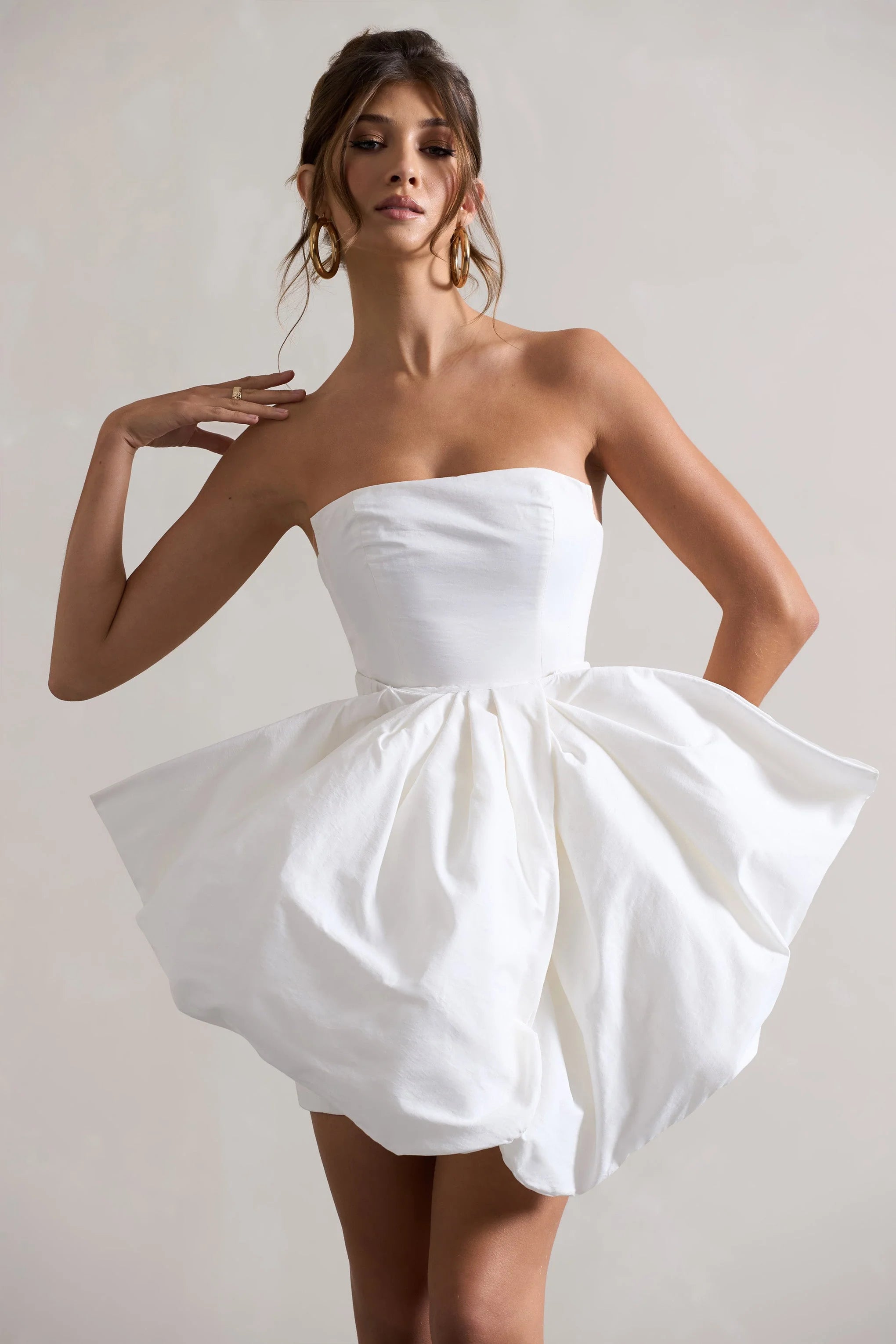 A statement piece for any special event, turn your attention to Bladen. Crafted in a cream shade of our signature crepe fabric, this charming mini dress features a bandeau neckline and sculpting boned bodice. Creating unexpected dimension and plenty of drama is a detachable bow belt that offers the element of a personalised fit.