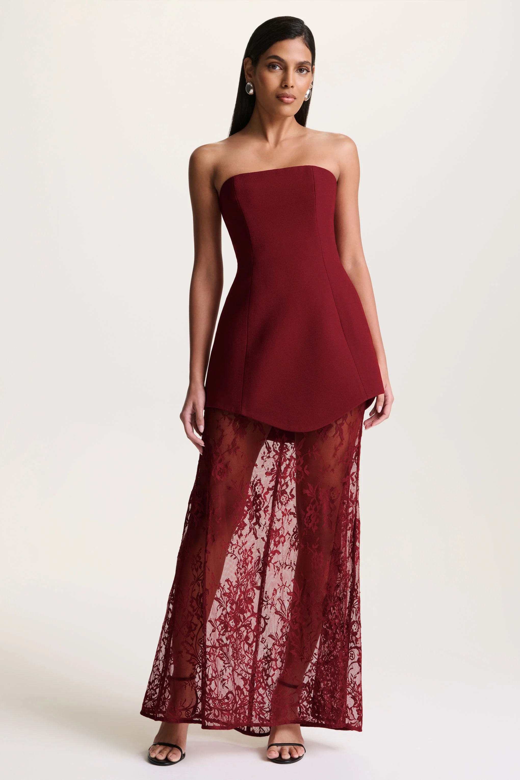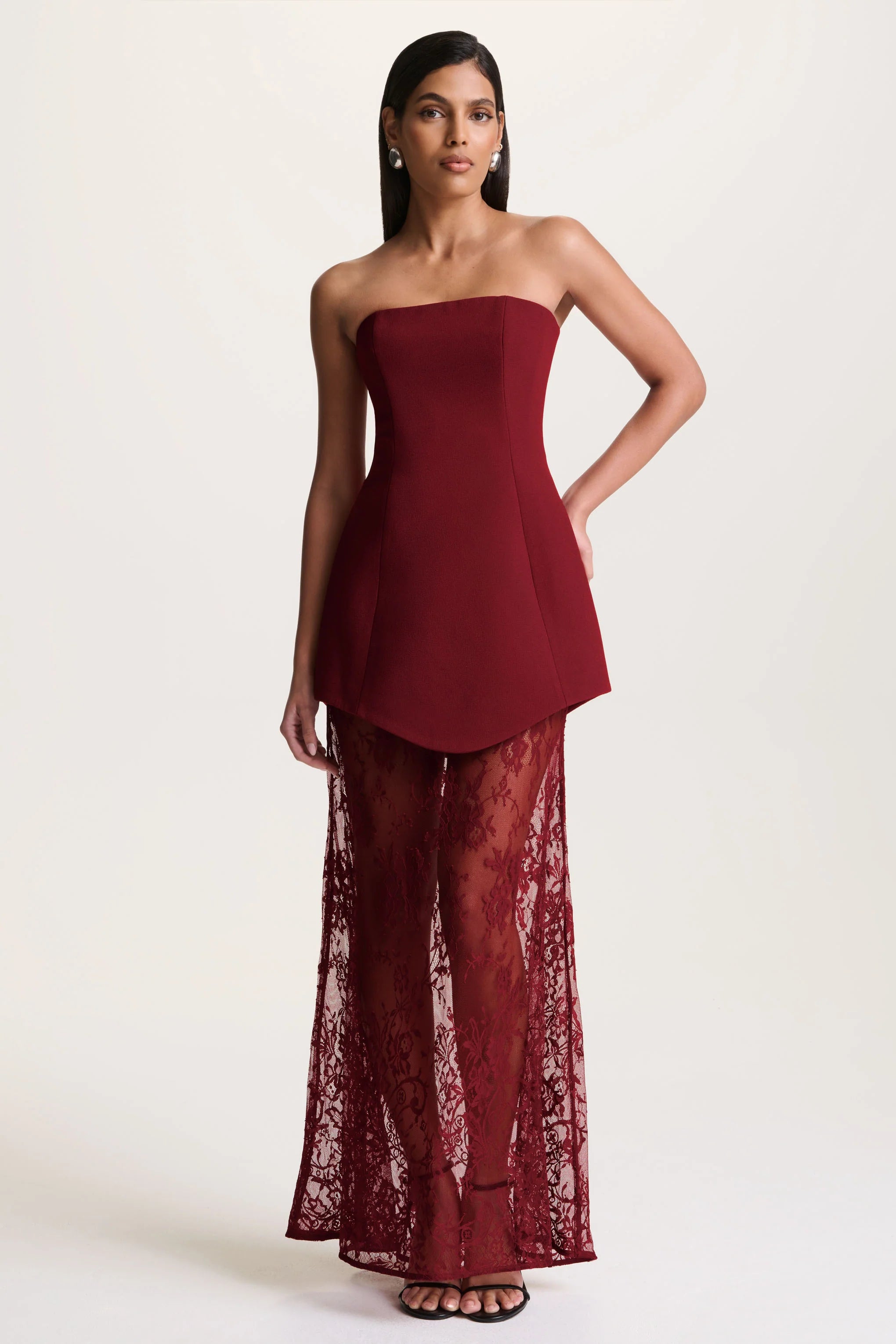 Brandi blends alluring elegance with refined couture detailing. Crafted from our premium burgundy crepe and delicate lace, this maxi-length design creates a striking contrast of structure and softness. The bandeau neckline offers a clean, frame, while the corset bodice sculpts the silhouette with ease. A sheer lace skirt adds a touch of ethereal drama, revealing graceful movement with every step. Designed for evenings that demand bold glamour and elevated femininity, Brandi is a statement of irresistible sophistication.