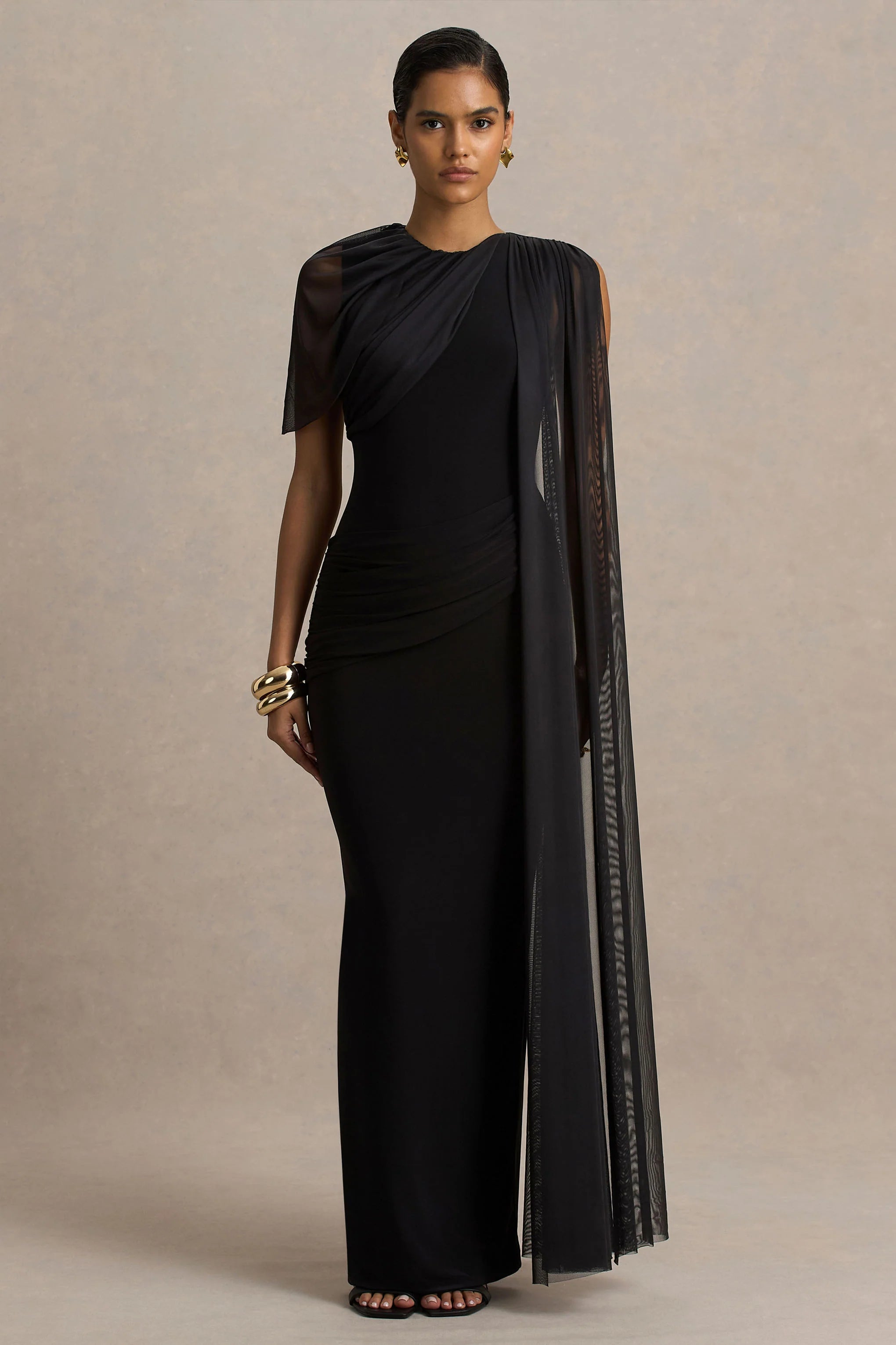 Step into effortless elegance with Brenda, a maxi that combines classic sophistication with a modern twist. Crafted from our premium stretch jersey and delicate mesh, this black hued dress offers a flattering silhouette that moves gracefully with you. Featuring a timeless round neckline, a dramatic mesh-cape sleeve in sheer mesh, and a sash detail that adds subtle definition, Brenda is beautifully finished with ruched detailing to enhance your curves. Perfect for making a statement at any special occasion.