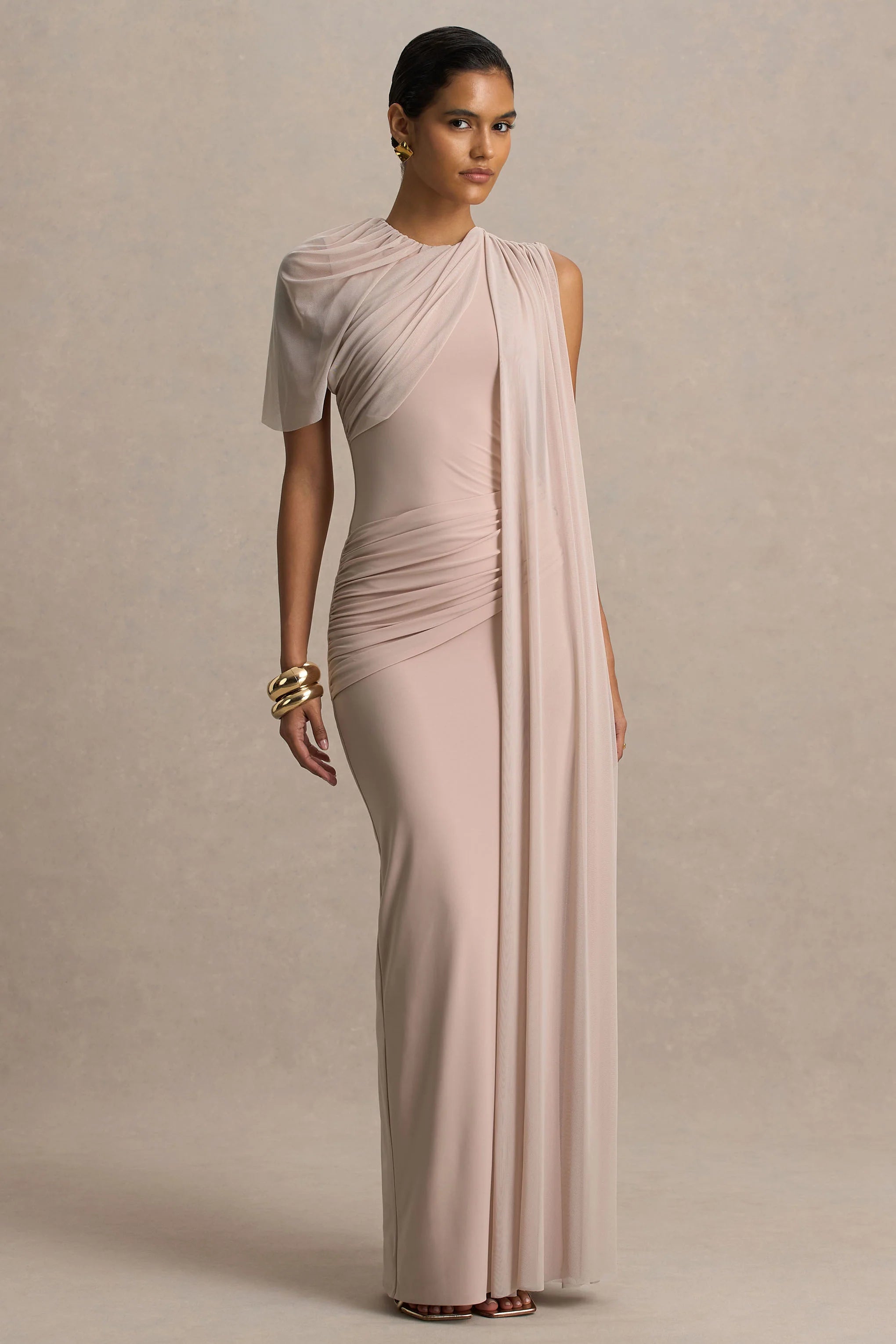 Step into effortless elegance with Brenda, a maxi that combines classic sophistication with a modern twist. Crafted from our premium stretch jersey and delicate mesh, this champagne hued dress offers a flattering silhouette that moves gracefully with you. Featuring a timeless round neckline, a dramatic mesh-cape sleeve in sheer mesh, and a sash detail that adds subtle definition, Brenda is beautifully finished with ruched detailing to enhance your curves. Perfect for making a statement at any special occasion.
