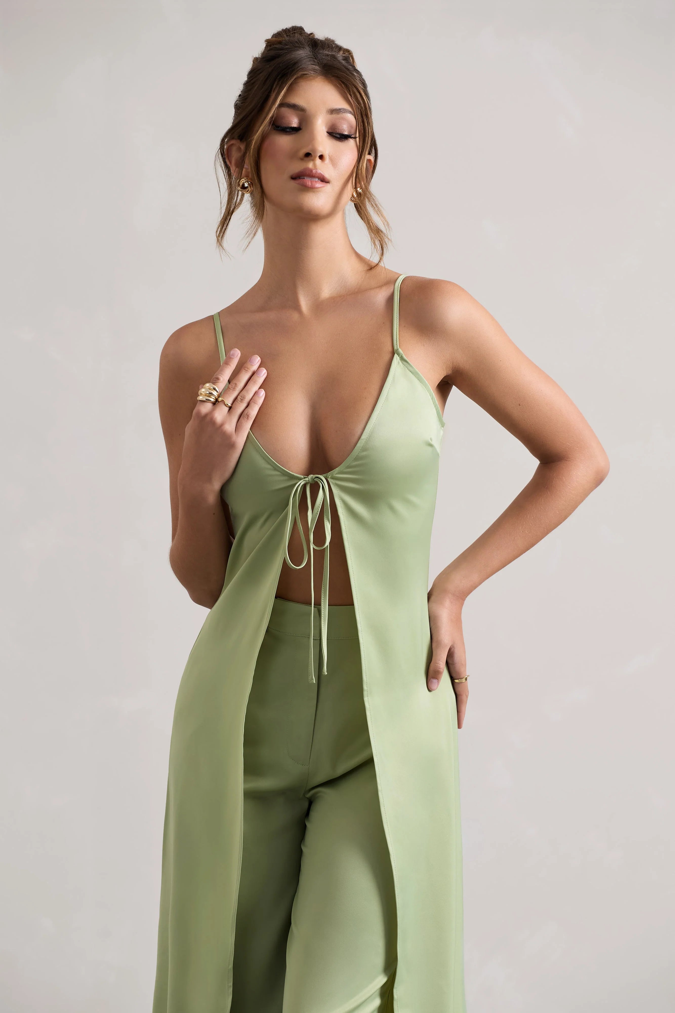 Crafted in our signature silky satin in a pale green, Calvi is a statement piece for any event. Boasting adjustable cami straps and a self-tie front for a custom fit, style yours with our Your Way trousers for a match made in heaven.