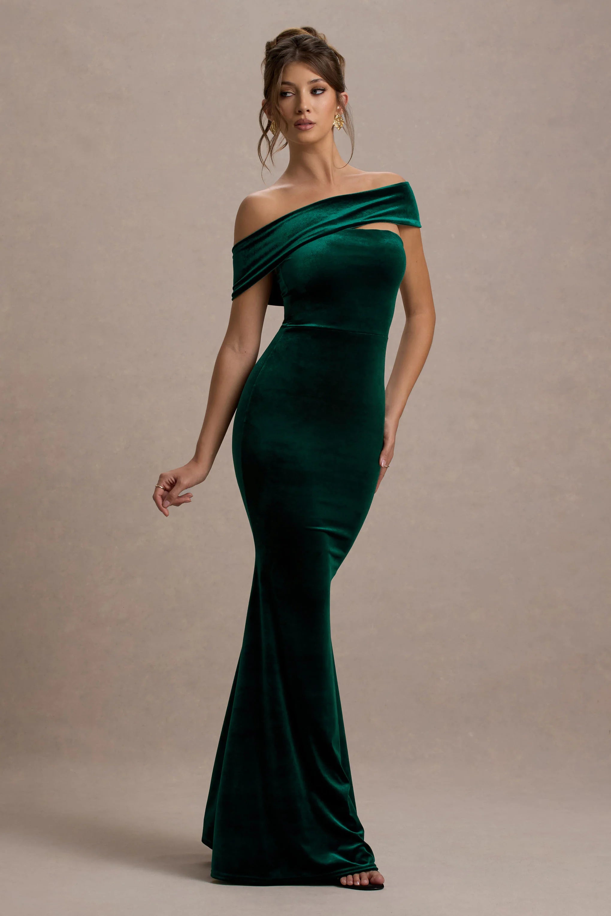 The Candela maxi dress in a glamorous green velvet seamlessly blends classic style and statement luxury. Featuring a sophisticated asymmetric bardot neckline and a waist-cinching bodice, Candela will effortlessly elongate your feminine silhouette.