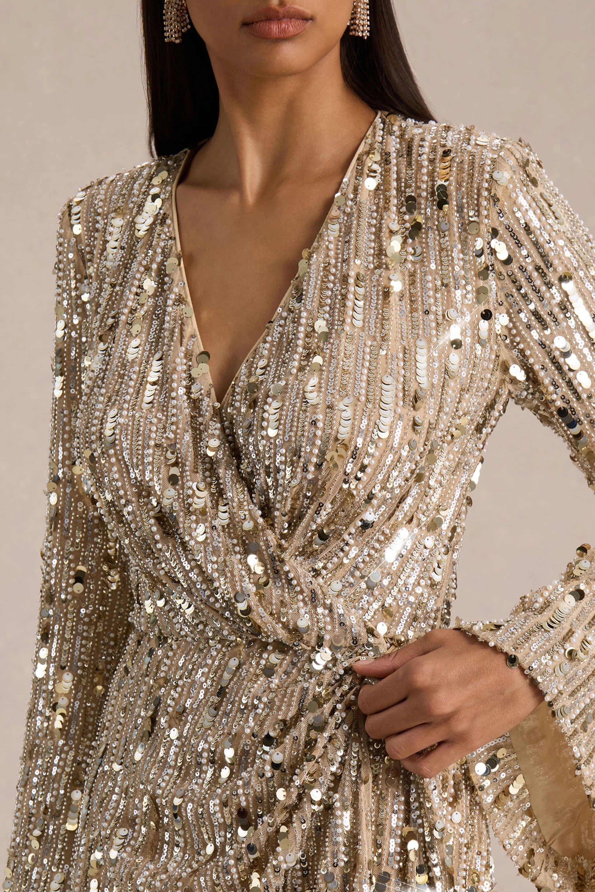 Introducing Carmina, the mini that owns the spotlight. Crafted from our premium gold sequins, this mini wrap dress shimmers with every move, effortlessly sculpting a flattering silhouette. The plunge neckline turns up the allure, while fluted sleeves add a playful, dramatic touch. Carmina is pure party energy- made for nights that demand attention.