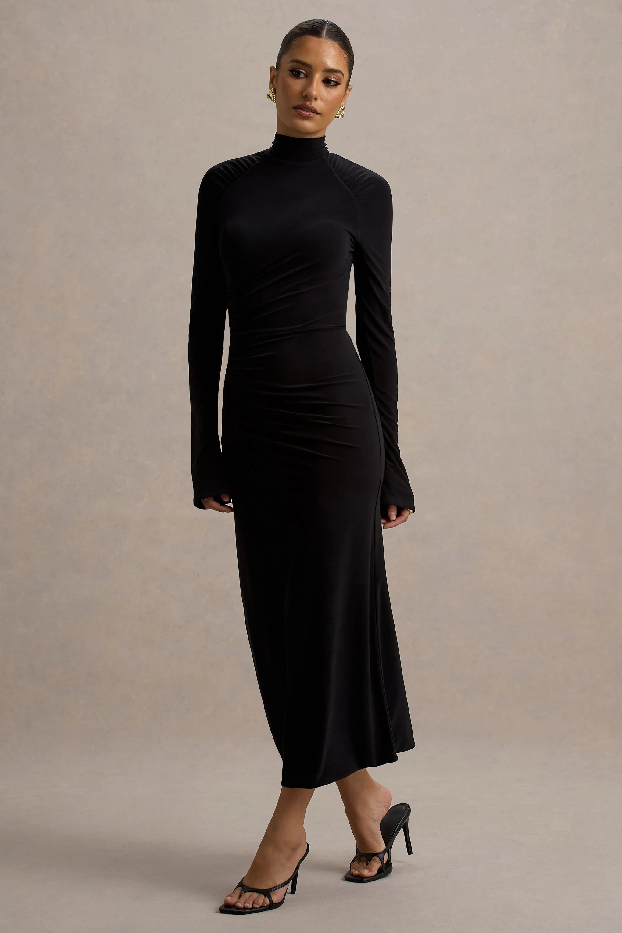 Cassandra is the ultimate number-one go-to for any weekend destination. Whether out in the city or brunching with the girls, this chic midi dress is perfect for every occasion. Crafted from premium black stretch jersey and adorned with romantic ruched drapery, it's a style hard to take your eyes off. Leave the room knowing your style was on point with this look.