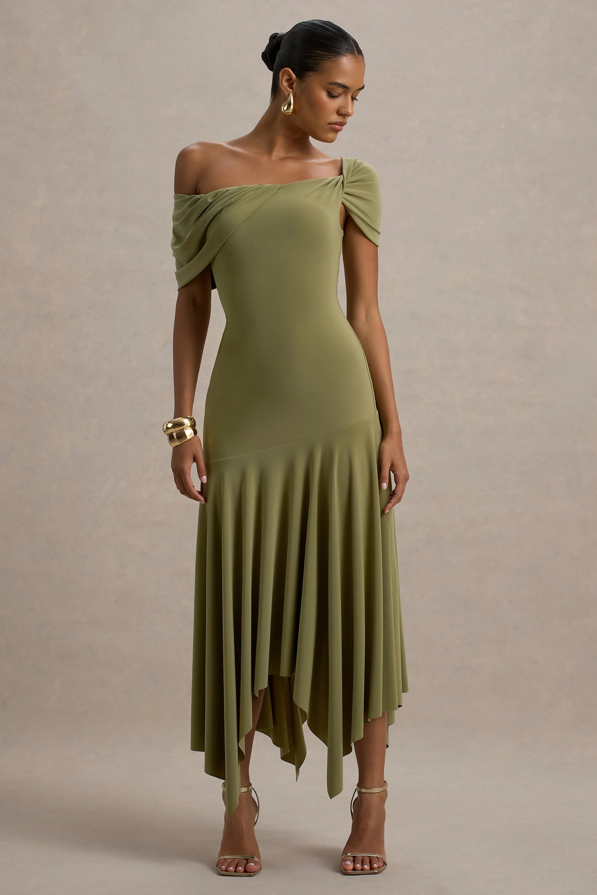 Whether you're searching for the perfect wedding guest dress, garden party look or baby shower staple, Castor is your answer. Crafted from our premium stretch jersey in a subtle shade of olive, this asymmetric midi will see you through the season with grace and class.