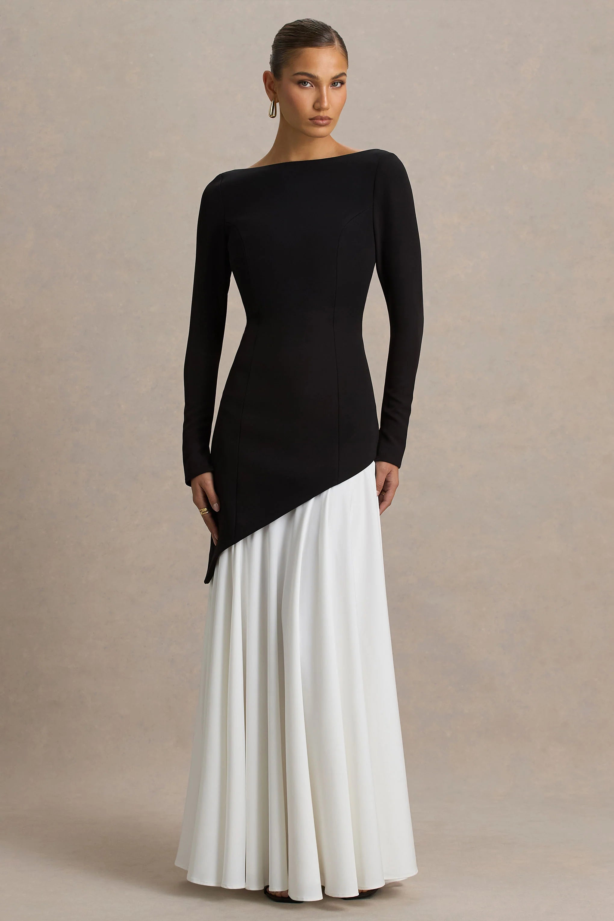 Introducing Caty, a striking maxi that effortlessly combines drama and elegance. Crafted from our premium lightweight woven fabric, in a striking black and white contrast, this maxi skims the body for a flattering fit. Featuring a slashed neckline and an asymmetric drop-waist, Caty offers a modern twist on classic silhouettes, while the scooped back adds a subtle hint of allure. Finished with a hanky hemline that moves beautifully with every step, this dress is made for making an unforgettable entrance.