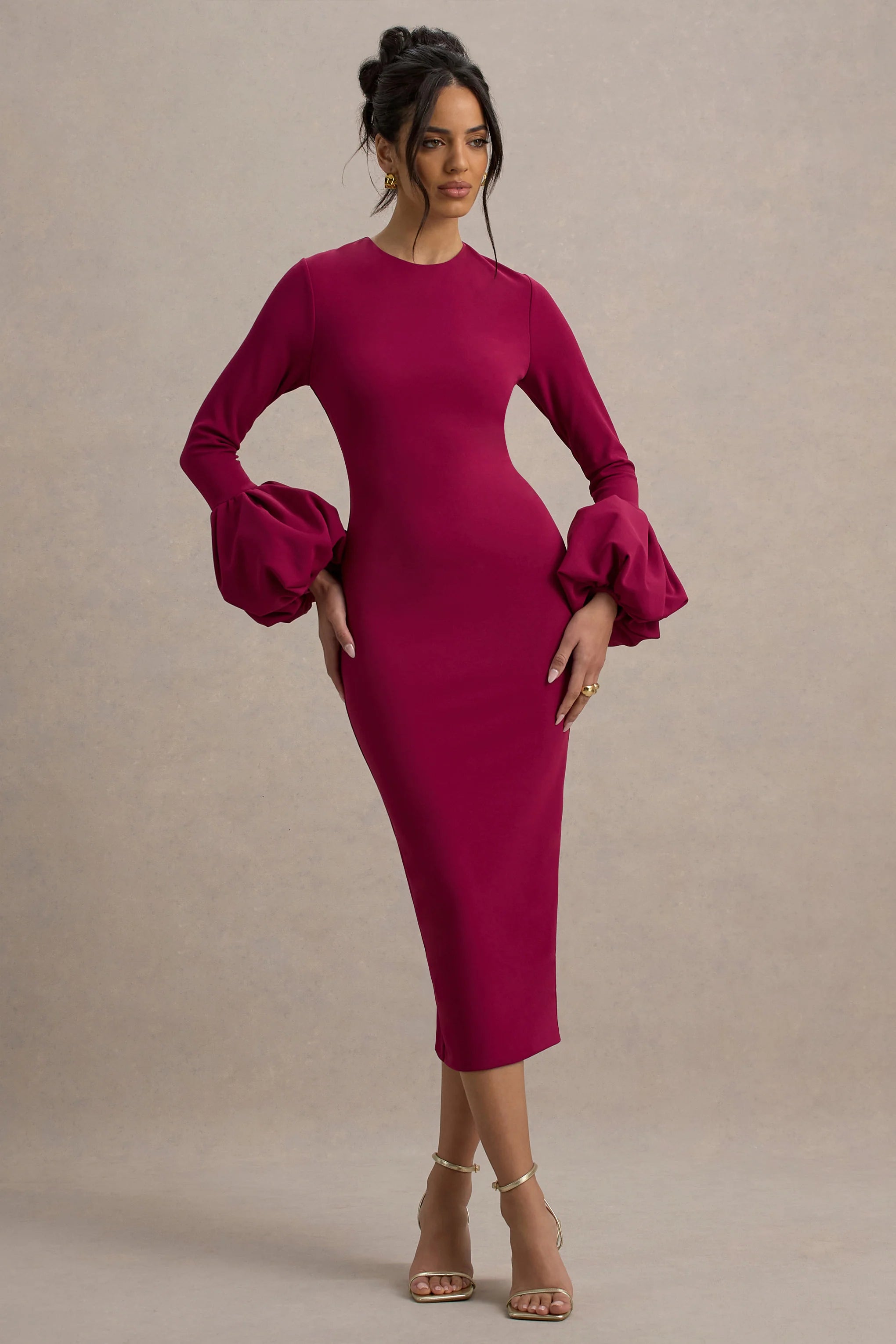 Get ready to embrace your inner chic with our latest midi Celie. Crafted from our premium scuba foam in a gorgeous mulberry hue, this staple features dramatic puff cuffs which transform into a sleek bodycon silhouette. Style your Celie with stilettos and a little clutch for the perfect ensemble.