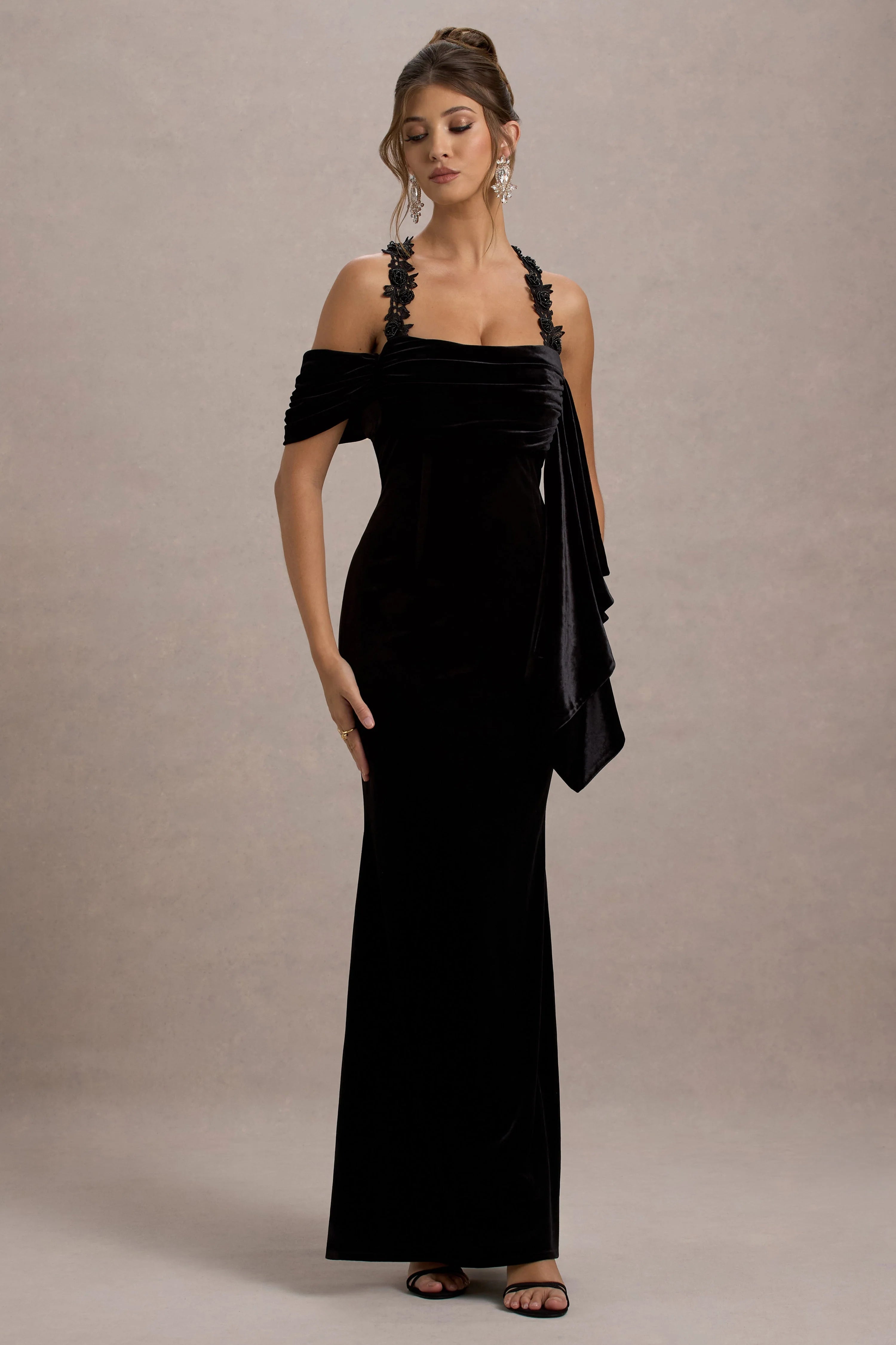 Made for grand entrances, gift your wardrobe with a special piece like Charlize. Crafted in a sumptuously soft black velvet, this floor-sweeper boasts a lace halter neckline, draped sleeve and flowing waterfall drape. Compliment this black maxi dress with some sparkling accents like Coralie during this event season.