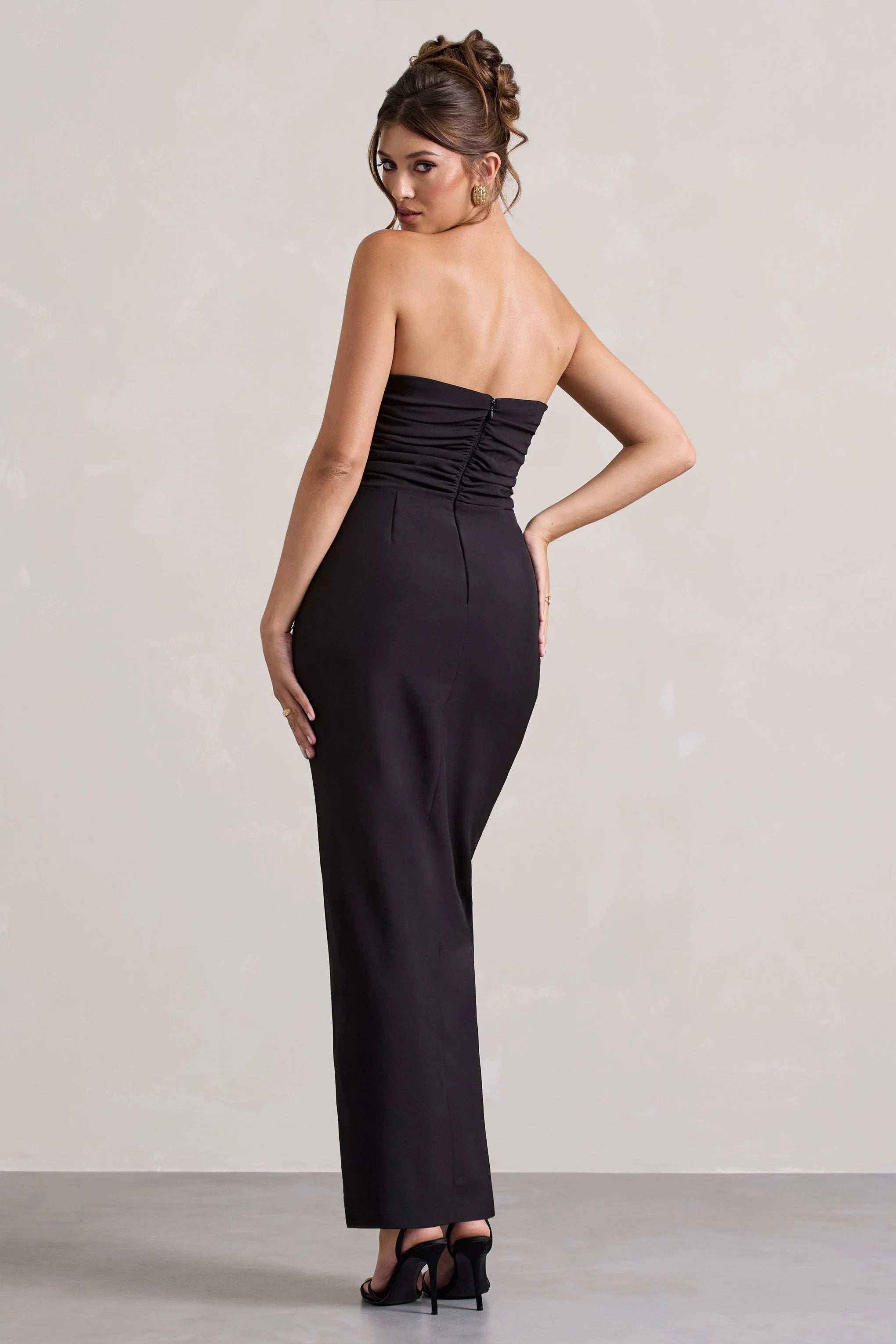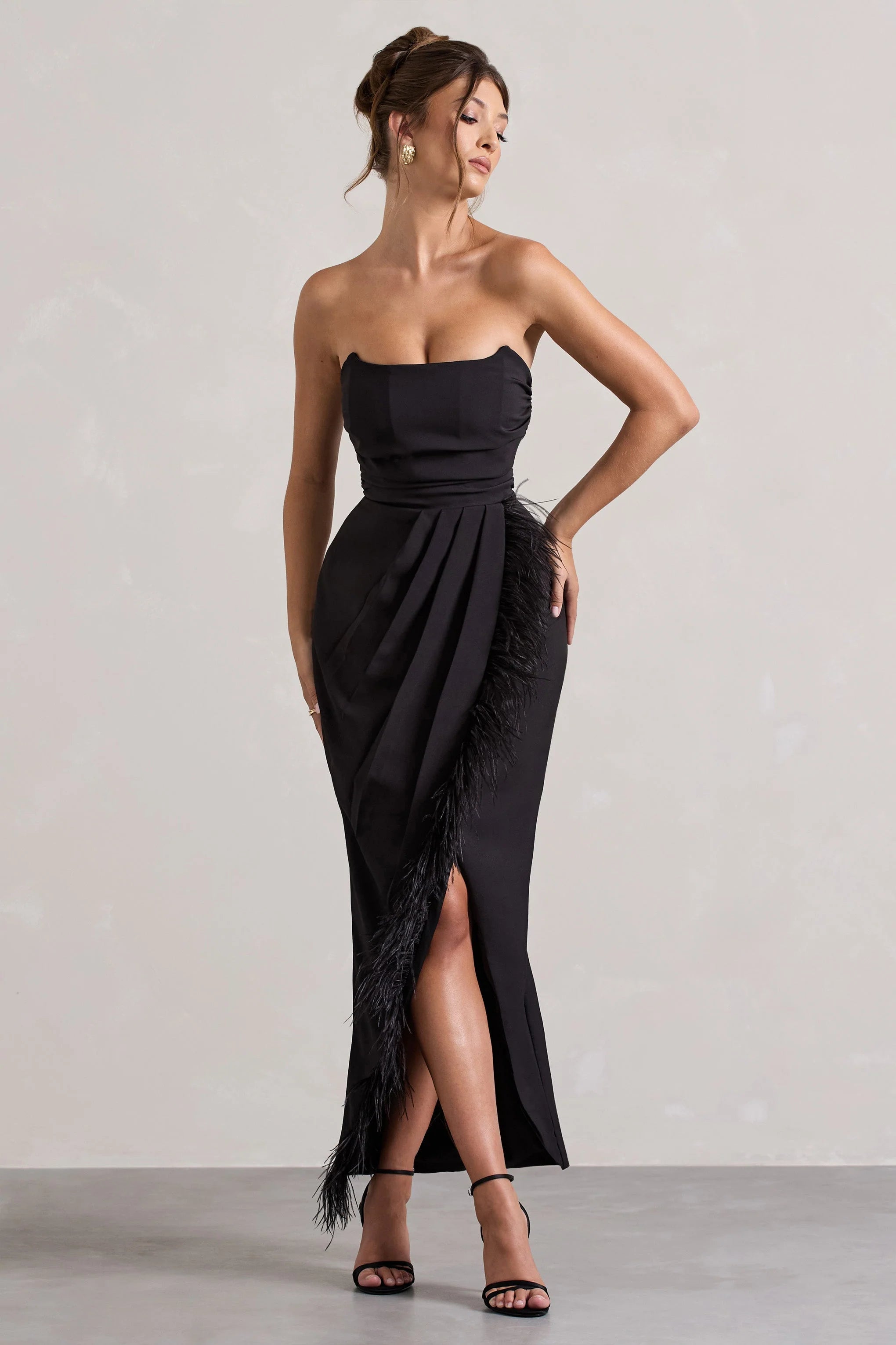 Go for maximum impact this event season in Chosen, our alluring black maxi dress. Crafted in our signature crepe, this strapless show-stopper boasts a boned corset bodice, wrap skirt and a wispy feather trim.