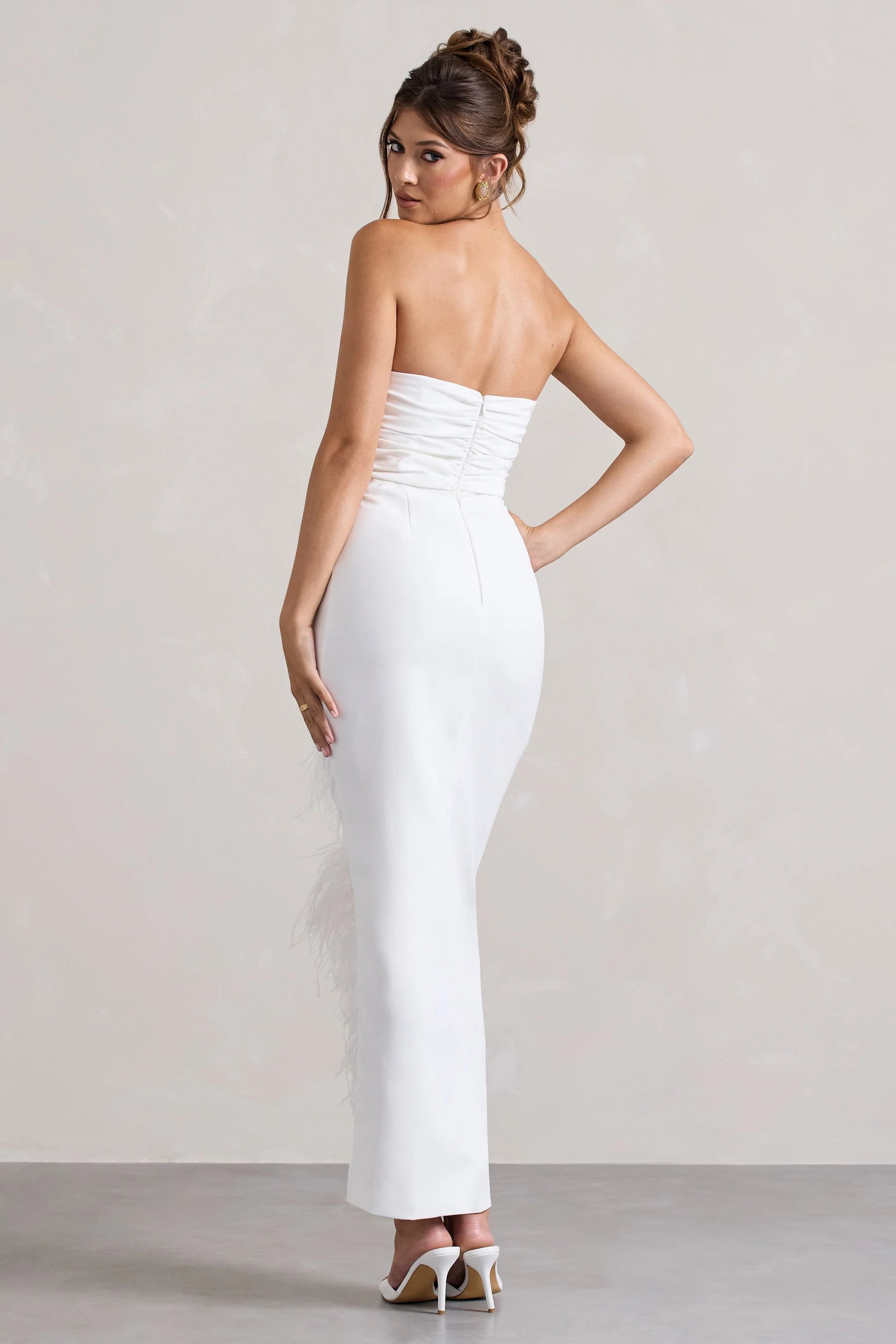 Go for maximum impact this event season in Chosen, our alluring white maxi dress. Crafted in our signature crepe, this strapless show-stopper boasts a boned corset bodice, wrap skirt and a wispy feather trim.