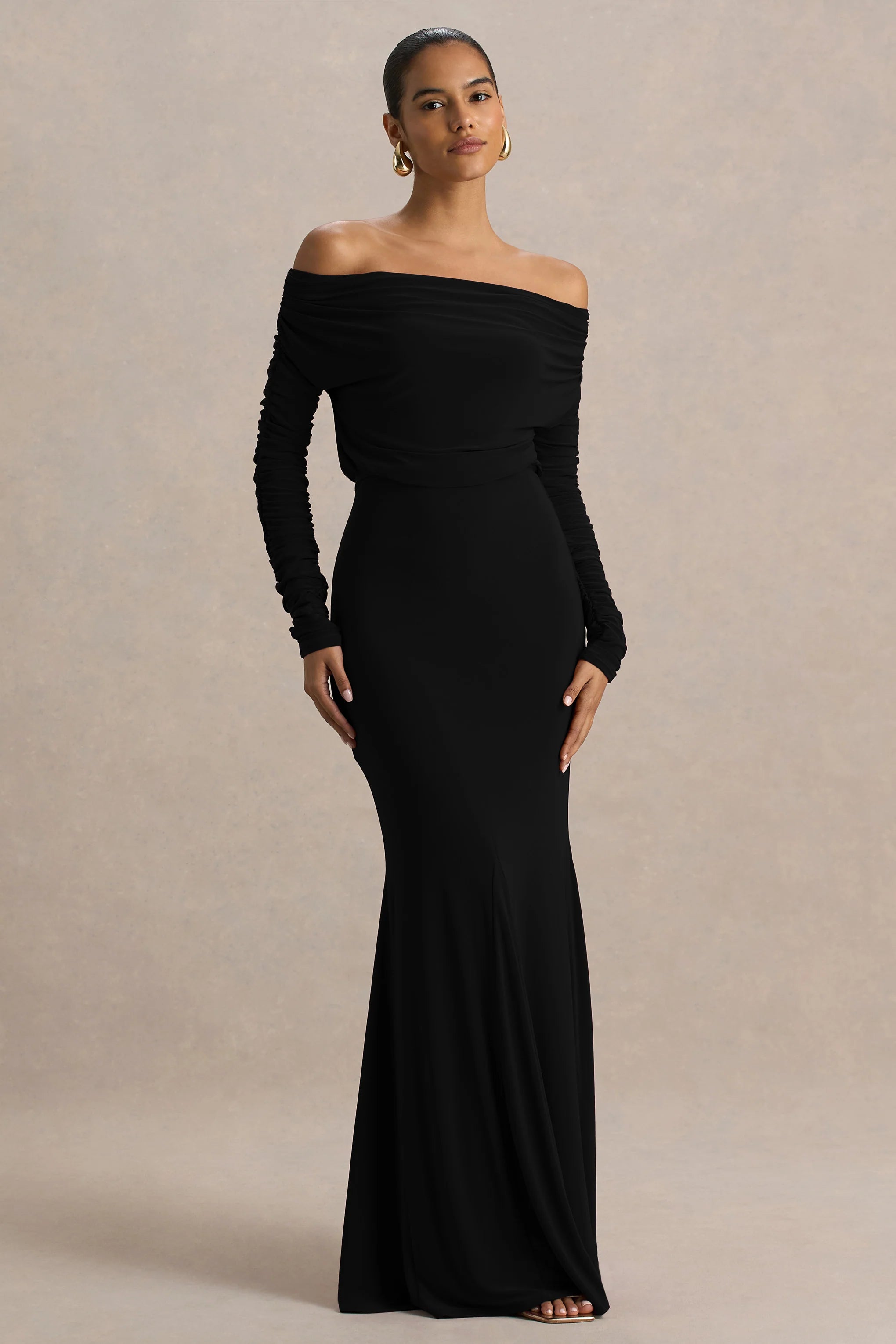 Unveil timeless elegance with Cilla, a beautifully sculpted maxi designed to command attention. Crafted from premium stretch jersey in a rich black hue, this dress smooths and contours the body with a flawless fit. The bardot neckline highlights the decolletage with romantic charm, while long sleeves add balance and sophistication. Ruching throughout enhances your curves, flowing into a dramatic fishtail skirt that moves with effortless grace. In Cilla you will turn-heads at your next dressed up occasion.